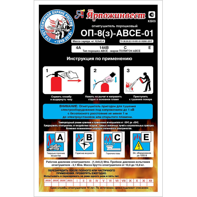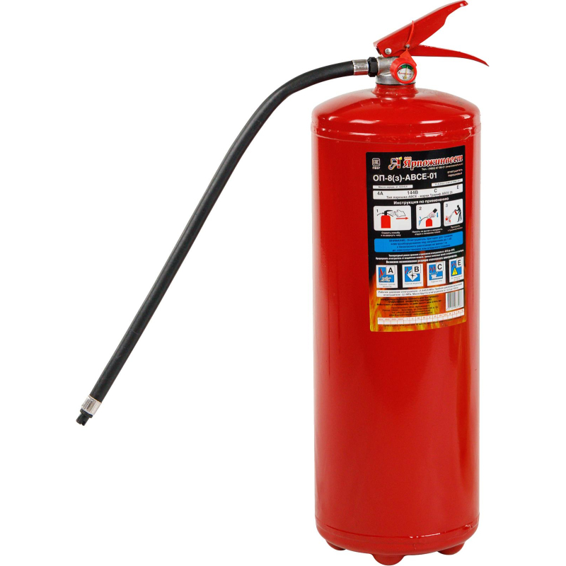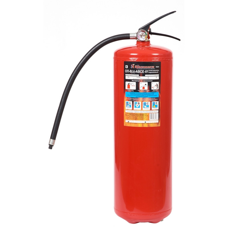 Огнетушитель порошковый ОП-8 (з) АВСЕ предназначен для защиты помещений производственного и хозяйственного назначения, применения на автомобильном, железнодорожном, речном транспорте, морских судах и в бытовых условиях в качестве первичных средств тушения пожаров классов А (твердых горючих веществ), В (жидких горючих веществ), С (газообразных горючих веществ)и электроустановок, находящихся под напряжением до 1000 В. Огнетушитель не предназначен для тушения загораний щелочных и щелочноземельных металлов и материалов, горение которых может происходить без доступа воздуха. Рекомендуется использовать при температуре от -50 до +50 °C. Огнетушитель способен подавать струю огнетушащего состава на расстояние не менее 4-х метров. Огнетушащая способность (ранг огнетушителя): 4А, 144В, С, Е (электроустановки под напряжением до 1000 В). Рабочее давление: 1.4+0.2 МПа. Вес огнетушителя: 10.59 кг. Вес огнетушащего порошка: 8 кг. Марка порошка: 'Триумф'. Время подачи огнетушащего вещества: 15 секунд. Площадь тушения: 18.66 кв.м. Диаметр баллона: 160 мм. Гарантийный срок: 18 месяцев. Срок службы огнетушителя: 10 лет. Производитель: 'Ярпожинвест'. Комплектация: огнетушитель заряженный с опломбированным ЗПУ с распылителем, руководство по эксплуатации, объединенное с паспортом, шланг с распылителем с насадкой. Соответствует стандарту ГОСТ Р51057-2001. Огнетушитель относится к сегменту 'эконом'. Качество соответствует заявленным характеристикам и стандарту ТР ЕАЭС 043/2017 'О требованиях к средствам обеспечения пожарной безопасности и пожаротушения'. Возможность получения компенсации от ФСС на основании наличия заключения Минпромторга РФ на этот артикул не распространяется. Перезарядка осуществляется через 5 лет с даты производства огнетушителя.