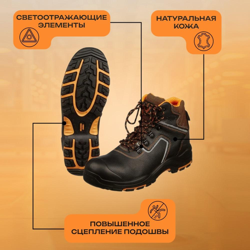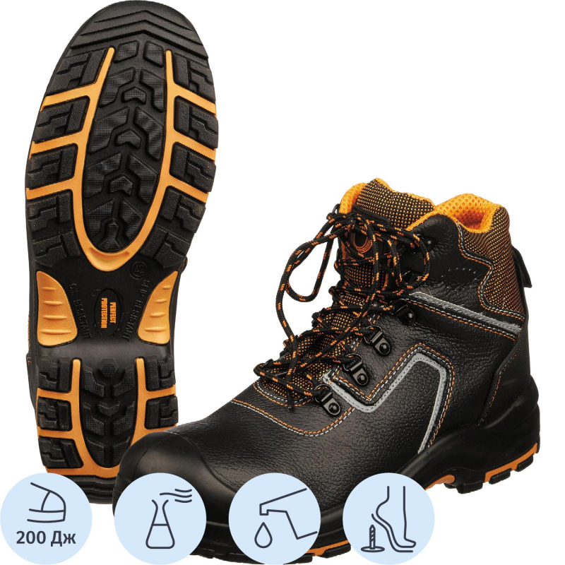 Ботинки модели Perfect Protection подходят как для мужчин, так и для женщин. Выполнены в черном цвете. Размер 36. Обувь рекомендована к использованию в строительстве, озеленении территории, ЖКХ, промышленности, логистике, нефтегазовой промышленности. Рабочая обувь из натуральной кожи долговечна, устойчива к повреждениям, комфортна в носке. Фиксируется обувь на ноге с помощью шнурков, которые плотно обхватывают стопу, улучшая комфорт ношения. В качестве подкладки используется современный подкладочный материал "Типика" на нетканой основе. Сетчатый материал эффективно отводит влагу от стопы, а также обеспечивает гигиеничность. Противоударный композитный (поликарбонатный) подносок, который выдерживает силу удара до 200 Дж, снижает количество травм на производстве, защищая стопу от травм. Подошва двухслойная, из полиуретана с нитрилом (ПУ+НР): маслобензостойкая, кислотощелочестойкая. Подошва обладает прекрасным сопротивлением к скольжению, устойчива к деформации и стиранию. Промежуточный слой из полиуретана придает подошве легкость, а ходовой слой из нитрильной резины (нитрил) устойчив к многократному изгибу, деформации и истиранию, что увеличивает срок службы изделия. Обувь выдерживает температурные режимы от -40 до 300 °C (в течение 60 секунд). Литьевой метод крепления подошвы обеспечивает надежное скрепление, а значит, долгий срок службы и высокую гибкость, тем самым уменьшая усталость ног. Антипрокольная стелька из кеврала, которая так же, как и подносок, снижает количество травм на производстве, защищая стопу от травм. Защитные свойства обуви: Мун 200 (защита от ударов в носочной части энергией 200 Дж), З (защита от общих производственных загрязнений). Гарантийный срок составляет 70 дней при соблюдении правил ухода, эксплутации и хранения. Соответствуют стандартам ТР ТС 019/2011. Цвет на изображении товара в интернет-магазине или в печатном каталоге может отличаться от оригинала из-за особенностей цветопередачи монитора.