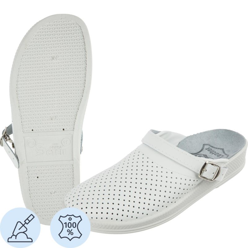Туфли сабо являются удобной мужской обувью и используются в медицинских учреждениях, в легкой промышленности и как повседневная обувь. Модель выполнена в белом цвете. Размер 46. Изготавливаются из натуральной кожи. Поворотный регулируемый ремешок может располагаться впереди, для декорации, и сзади, для фиксации пятки. Подошва сабо изготовлена из ПВХ. литьевого метода крепления с четким нескользящим протектором. Гарантийный срок эксплуатации 6 месяцев при условии применения по назначению и соблюдения правил эксплуатации, ухода и хранения. Эксплуатация обуви возможна в соответствии с сезонным назначением и в помещении. Не пригодна для условий с пониженными температурами. Температурный диапазон от +35 до 0 градусов по Цельсию. Предназначены для защиты от общепроизводственных загрязнений. Соответствуют стандартам ГОСТ 26167-2005, ТР ТС 017/2011. Цвет на изображении товара в интернет-магазине или в печатном каталоге может отличаться от оригинала из-за особенностей цветопередачи монитора. ЗАКЛЮЧЕНИЕ МИНПРОМТОРГА РФ МОЖЕТЕ СКАЧАТЬ ЗДЕСЬ: