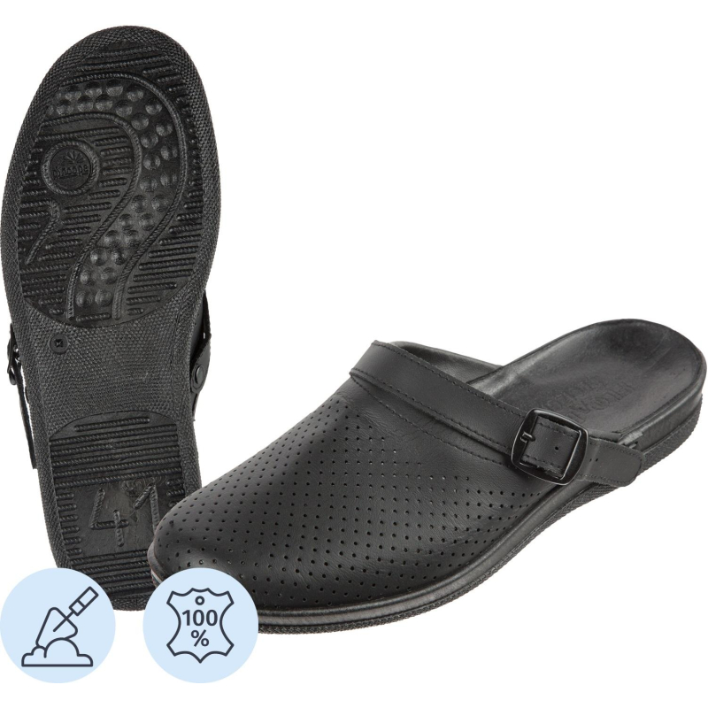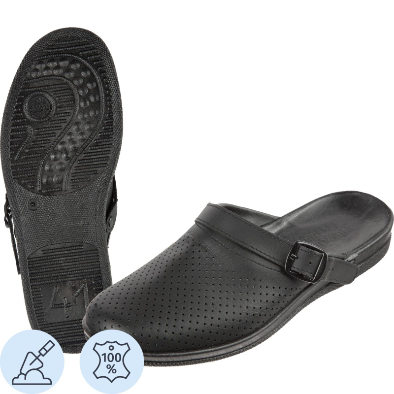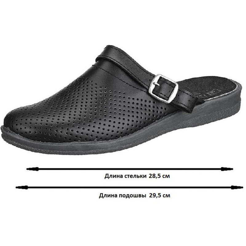 Туфли сабо модели Ионел являются удобной мужской обувью и используются в медицинских учреждениях, в легкой промышленности и как повседневная обувь. Выполнена модель в черном цвете. Размер 45. Изготавливаются из натурального спилка (кожа) толщиной 1,8. Поворотный регулируемый ремешок может располагаться впереди, для декорации, и сзади, для фиксации пятки. Подошва на танкетке литьевого метода крепления с четким нескользящим протектором на облегченном ПВХ. Срок эксплуатации 90 дней, срок хранения 36 месяца при соблюдении условий эксплуатации, хранения и транспортировки. При длительном воздействии пониженных температур от -20 °C материал, из которого изготовлена обувь, теряет свои свойства и становится хрупким. Предназначены для защиты от общих загрязнений. Соответствуют стандартам ТР ТС 017/2011. Цвет на изображении товара в интернет-магазине или в печатном каталоге может отличаться от оригинала из-за особенностей цветопередачи монитора.