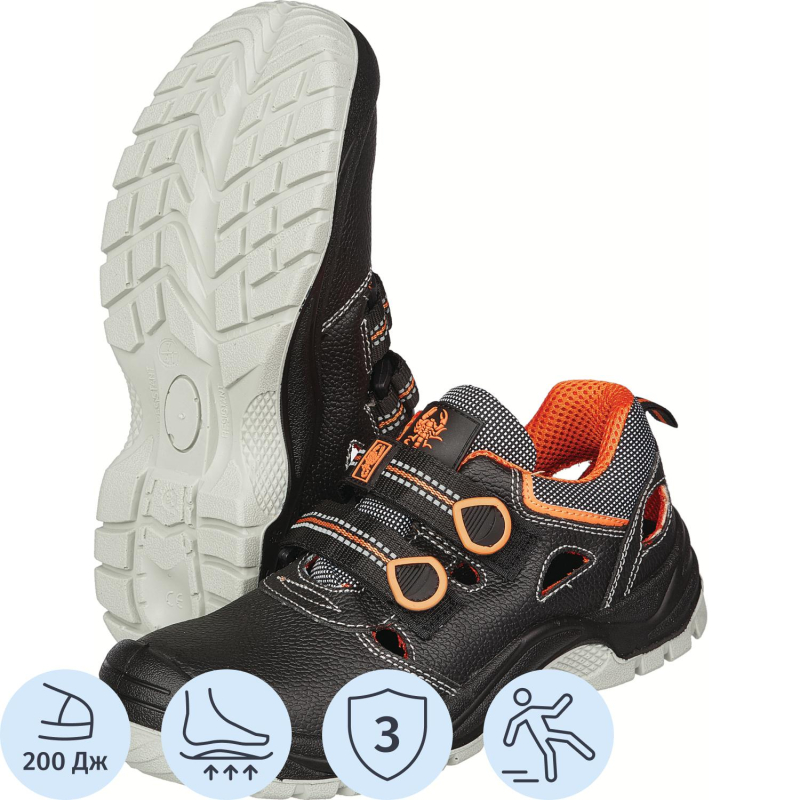Полуботинки с перфорацией (сандалии) модели 1303ПК - универсальная обувь, подходящая как для мужчин, так и для женщин. Размер: 45, черного цвета. Ботинки оборудованы удобными ремнями-липучками для надежной фиксации на стопе. Предназначены для использования в энергетической промышленности и при проходе через металлодетекторы. Изготовлены из натуральной кожи без металлической фурнитуры. Верх обуви обладает отличной воздухопроницаемостью, обеспечивая комфорт и анатомическую поддержку стопы. Композитный (поликарбонатный) подносок защищает от ударов силой до 200 Дж. Подошва обуви антистатичная, противоскользящая, маслобензостойкая. Двухслойная конструкция из полиуретана и термополиуретана обеспечивает амортизацию, защиту от деформаций, а также повышенные теплозащитные свойства. Литьевой метод крепления подошвы гарантирует долговечность и надежность обуви. Обувь рекомендуется для работы в помещениях с повышенной температурой, обладает высокими защитными свойствами. Соответствует стандартам ГОСТ Р 12.4.187-97, ГОСТ 12.4.033-95, ГОСТ 28507-90, ТР ТС 019/2011. Для продления срока службы обуви рекомендуется соблюдать условия транспортировки и хранения, регулярно чистить и смазывать. Гарантийный срок носки составляет 5 лет. Обувь обеспечивает надежную защиту и комфорт при длительном ношении, подчеркивая безопасность и удобство в рабочих условиях.