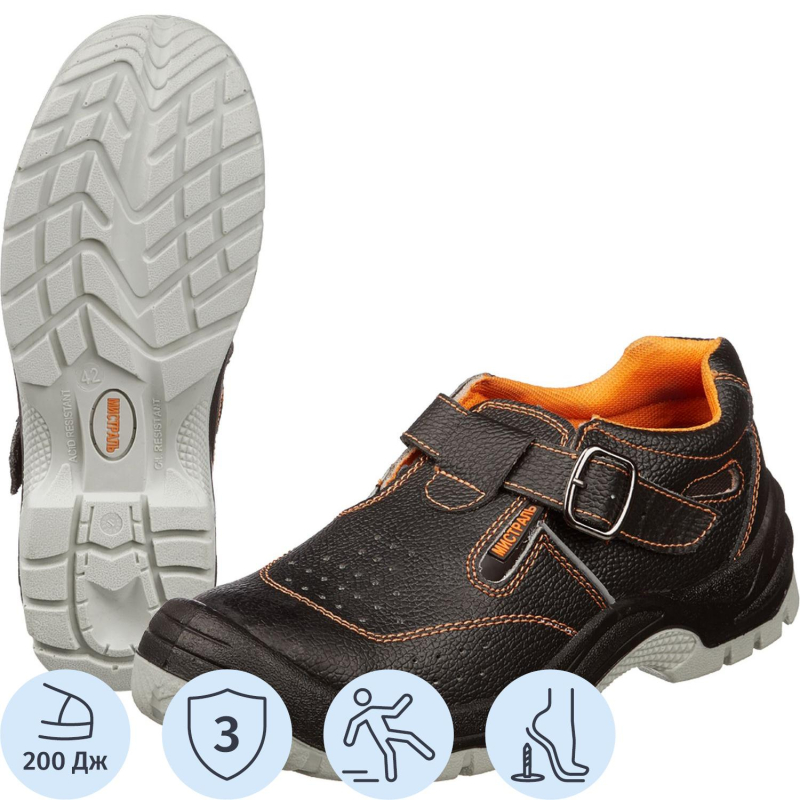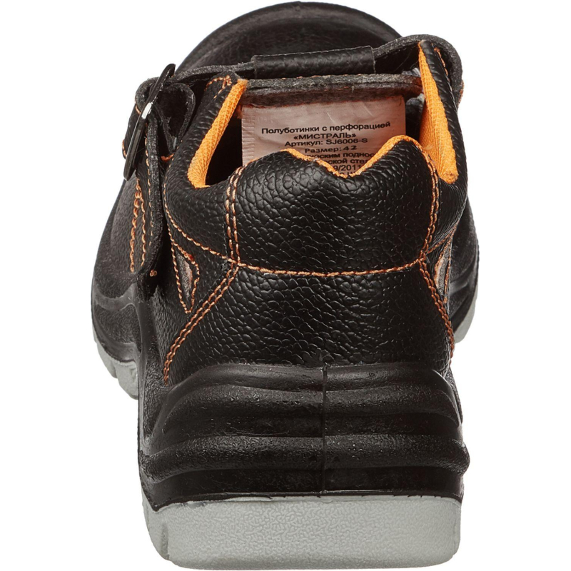 Предлагаемые полуботинки с перфорацией (сандалии) модели Мистраль выполнены в черном цвете. Размер: 38. Ботинки подходят как для мужчин, так и для женщин. Рекомендуются для использования в нефтегазовой промышленности, тяжелой промышленности, логистике, строительстве, озеленении территорий и ЖКХ. Материал верхней части обуви - комбинированная кожа, обладающая воздухопроницаемыми свойствами, которая не дает ногам потеть. Подкладка выполнена из современного материала 'Типика' на нетканой основе, который эффективно отводит влагу от стопы. Сандалии фиксируются на ноге с помощью ремня с пряжкой. Имеется металлический подносок и металлическая антипрокольная стелька для защиты стопы от травм. Подошва и стелька изготовлены из полиуретана с термополиуретаном (ПУ+ТПУ), устойчивого к химическим факторам (нефть, масла, щелочь, кислота). Эргономичная форма подошвы снижает усталость ног, а также выдерживает температуру от -30 до +130 градусов Цельсия. Обувь с данной подошвой легкая, устойчива к деформациям и истираниям. Метод крепления подошвы - литьевой, обеспечивающий надежное скрепление верхней части обуви и подошвы. Защитные свойства подноска - Мун 200 (защита от ударов в носочной части энергией 200 Дж). Обувь соответствует стандартам ГОСТ 12.4.033-77, ГОСТ 12.4.177-89, ГОСТ 28507-99, ГОСТ Р 12.4.187-97, ТР ТС 019/2011. Сандалии рекомендуется использовать в помещениях с повышенной температурой. Гарантийный срок после выдачи обуви составляет 70 дней при соблюдении правил ухода, эксплуатации и хранения.