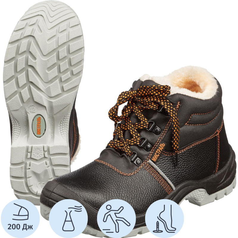 Ботинки утепленные Мистраль выполнены в черном цвете. Размер 37. Обувь рекомендована к использованию в строительстве, озеленении территории, ЖКХ, промышленности, логистике, нефтегазовой промышленности. Верх обуви выполнен из натуральной кожи. Рабочая обувь из натуральной кожи долговечна, устойчива к повреждениям, комфортна в носке. Натуральная кожа обладает воздухопроницаемыми свойствами, не дает ногам потеть. Фиксируется обувь на ноге с помощью шнурков, которые плотно обхватывают стопу, улучшая комфорт ношения. Утеплитель из искусственного меха хорошо держит тепло, рассчитан на температурные режимы до -20 °C в сухой среде. Противоударный металлический подносок защищает от ударов в носочной части энергией 200 Дж, также ботинки имеют металлическую стельку, защищающую ногу от проколов. Подошва из полиуретана с термополиуретаном (ПУ+ТПУ): маслобензостойкая, кислотощелочестойкая. Обувь с данной подошвой выдерживает температурные режимы от -30 до 130 °C. Подошва обуви выполнена из промежуточного полиуретанового слоя, который придает легкость, и ходового слоя из термополиуретана, устойчивого к деформациям, истираниям. Метод крепления подошвы: литьевой. Обеспечивает надежное скрепление верхней части обуви и подошвы, тем самым обеспечивая герметичность обуви. Соответствует стандартам ТР ТС 019/2011. Гарантийный срок после выдачи обуви составляет 70 дней при соблюдении правил ухода, эксплуатации и хранения. Цвет на изображении товара в интернет-магазине или в печатном каталоге может отличаться от оригинала из-за особенностей цветопередачи монитора.