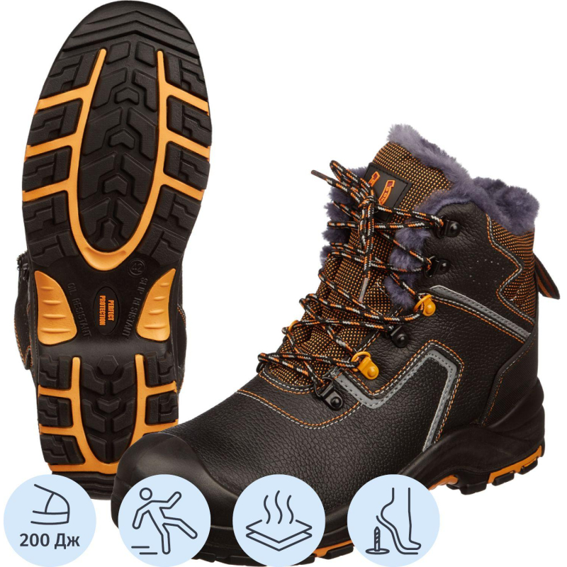 Ботинки утепленные Perfect Protection выполнены в черном цвете. Размер 46. Обувь рекомендована к использованию в строительстве, озеленении территории, ЖКХ, промышленности, логистике, нефтегазовой промышленности. Верх обуви выполнен из натуральной кожи. Рабочая обувь из натуральной кожи долговечна, устойчива к повреждениям, комфортна в носке. Натуральная кожа обладает воздухопроницаемыми свойствами, не дает ногам потеть. Фиксируется обувь на ноге с помощью шнурков, которые плотно обхватывают стопу, улучшая комфорт ношения. Утеплитель из натурального меха обладает высокими гигиеническими показателями: влагопоглощение и паропроницаемость, рассчитан на температурные режимы до -30 °C в сухой среде. Таким образом, данная обувь хорошо защищает от пониженных температур воздуха. Композитный (поликарбонатный) подносок защищает от ударов в носочной части силой 200 Дж, а кевларовая стелька - от проколов. Подошва из полиуретана с нитрилом (ПУ+НР): маслобензостойкая, кислотощелочестойкая, повышенная стойкость к контакту с нагретой поверхностью (до 300 °С). Подошва обладает прекрасным сопротивлением к скольжению, устойчива к деформации и стиранию. Промежуточный слой из полиуретана придает подошве легкость, а ходовой слой из нитрильной резины (нитрил) устойчив к многократному изгибу, деформации и истиранию, что увеличивает срок службы изделия. Литьевой метод крепления подошвы обеспечивает надежное скрепление, а значит долгий срок службы и высокую гибкость, тем самым уменьшая усталость ног. Обувь выдерживает температурные режимы от -40 до 300 °C (в течение 60 секунд). Соответствует стандартам ТР ТС 019/2011. Гарантийный срок составляет 70 дней при соблюдении правил ухода, эксплутации и хранения. Цвет на изображении товара в интернет-магазине или в печатном каталоге может отличаться от оригинала из-за особенностей цветопередачи монитора.