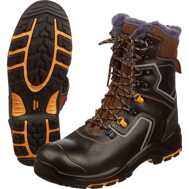 Ботинки модели Perfect Protection с высоким берцем подходят и для мужчин, и для женщин. Выполнены в черном цвете с желтыми элементами. Размер 38. Рекомендуется использовать в строительстве, ЖКХ, нефтегазовой промышленности, в логистике и озеленении территории. Верхняя часть изготовлена из натуральной кожи. Материал хорошо пропускает воздух, не боится механических повреждений, долго служит. Утеплитель из натурального меха обладает высокими гигиеническими свойствами, хорошо удерживает тепло в условиях низких температур (до -30 °C). Противоударный поликарбонатный подносок защищает ноги от ударов силой в 200 Дж. Берцы надежно фиксируют голеностоп шнурками, не нарушая при этом естественную подвижность ноги. Подошва из полиуретана с нитрилом устойчива к воздействию масла, бензина, кислот, щелочей. Она выдерживает прямые контакты с нагретыми поверхностями (до 300 °C). Обувь выдерживает температурные режимы от -40 до 300 °C (в течение 60 секунд). Подошва не скользит и обеспечивает устойчивость при ходьбе. Полиуретан в промежуточном слое обеспечивает легкость. Нитрильная резина в ходовой части устойчива к многократным изгибам, деформациям, истиранию. Литьевой метод крепления подошвы обеспечивает надежное скрепление, а значит долгий срок службы и высокую гибкость, тем самым уменьшая усталость ног. Кевларовая стелька защищает от проколов. Климатический пояс - 2,3,4 и Особый. Данная модель предназначена для защиты от ударов в носочной части (Мун 200), низких температур (Тн), общих производственных загрязнений (З). На ботинки предоставляется гарантия 70 дней при условии соблюдения правил эксплуатации, ухода, хранения. Соответствуют стандартам ТР ТС 019/2011. Цвет на изображении товара в интернет-магазине или в печатном каталоге может отличаться от оригинала из-за особенностей цветопередачи монитора.