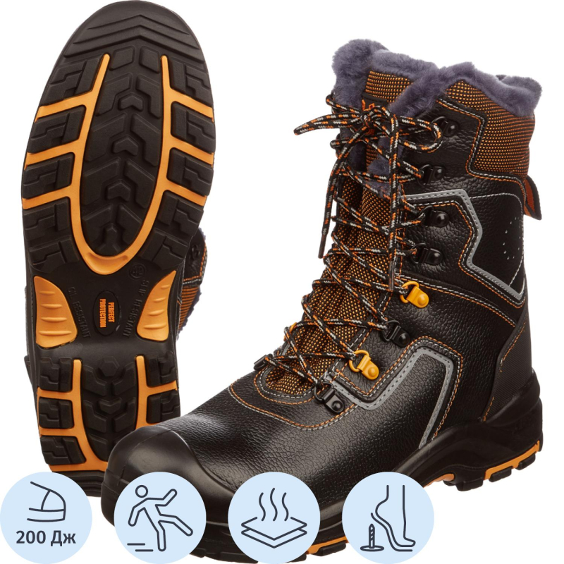 Ботинки модели Perfect Protection с высоким берцем подходят и для мужчин, и для женщин. Выполнены в черном цвете с желтыми элементами. Размер 42. Рекомендуется использовать в строительстве, ЖКХ, нефтегазовой промышленности, в логистике и озеленении территории. Верхняя часть изготовлена из натуральной кожи. Материал хорошо пропускает воздух, не боится механических повреждений, долго служит. Утеплитель из натурального меха обладает высокими гигиеническими свойствами, хорошо удерживает тепло в условиях низких температур (до -30 °C). Противоударный поликарбонатный подносок защищает ноги от ударов силой в 200 Дж. Берцы надежно фиксируют голеностоп шнурками, не нарушая при этом естественную подвижность ноги. Подошва из полиуретана с нитрилом устойчива к воздействию масла, бензина, кислот, щелочей. Она выдерживает прямые контакты с нагретыми поверхностями (до 300 °C). Обувь выдерживает температурные режимы от -40 до 300 °C (в течение 60 секунд). Подошва не скользит и обеспечивает устойчивость при ходьбе. Полиуретан в промежуточном слое обеспечивает легкость. Нитрильная резина в ходовой части устойчива к многократным изгибам, деформациям, истиранию. Литьевой метод крепления подошвы обеспечивает надежное скрепление, а значит долгий срок службы и высокую гибкость, тем самым уменьшая усталость ног. Кевларовая стелька защищает от проколов. Климатический пояс - 2,3,4 и Особый. Данная модель предназначена для защиты от ударов в носочной части (Мун 200), низких температур (Тн), общих производственных загрязнений (З). На ботинки предоставляется гарантия 70 дней при условии соблюдения правил эксплуатации, ухода, хранения. Соответствуют стандартам ТР ТС 019/2011. Цвет на изображении товара в интернет-магазине или в печатном каталоге может отличаться от оригинала из-за особенностей цветопередачи монитора.