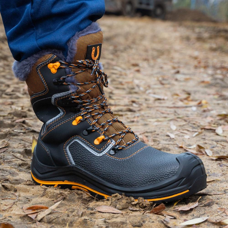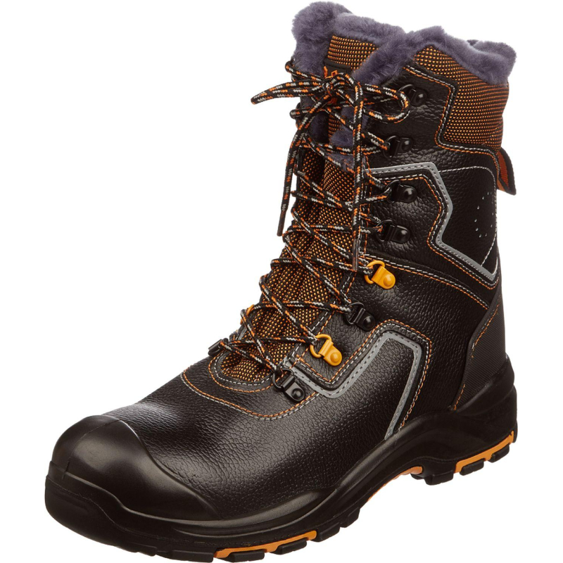 Ботинки модели Perfect Protection с высоким берцем подходят и для мужчин, и для женщин. Выполнены в черном цвете с желтыми элементами. Размер 44. Рекомендуется использовать в строительстве, ЖКХ, нефтегазовой промышленности, в логистике и озеленении территории. Верхняя часть изготовлена из натуральной кожи. Материал хорошо пропускает воздух, не боится механических повреждений, долго служит. Утеплитель из натурального меха обладает высокими гигиеническими свойствами, хорошо удерживает тепло в условиях низких температур (до -30 °C). Противоударный поликарбонатный подносок защищает ноги от ударов силой в 200 Дж. Берцы надежно фиксируют голеностоп шнурками, не нарушая при этом естественную подвижность ноги. Подошва из полиуретана с нитрилом устойчива к воздействию масла, бензина, кислот, щелочей. Она выдерживает прямые контакты с нагретыми поверхностями (до 300 °C). Обувь выдерживает температурные режимы от -40 до 300 °C (в течение 60 секунд). Подошва не скользит и обеспечивает устойчивость при ходьбе. Полиуретан в промежуточном слое обеспечивает легкость. Нитрильная резина в ходовой части устойчива к многократным изгибам, деформациям, истиранию. Литьевой метод крепления подошвы обеспечивает надежное скрепление, а значит долгий срок службы и высокую гибкость, тем самым уменьшая усталость ног. Кевларовая стелька защищает от проколов. Климатический пояс - 2,3,4 и Особый. Данная модель предназначена для защиты от ударов в носочной части (Мун 200), низких температур (Тн), общих производственных загрязнений (З). На ботинки предоставляется гарантия 70 дней при условии соблюдения правил эксплуатации, ухода, хранения. Соответствуют стандартам ТР ТС 019/2011. Цвет на изображении товара в интернет-магазине или в печатном каталоге может отличаться от оригинала из-за особенностей цветопередачи монитора.