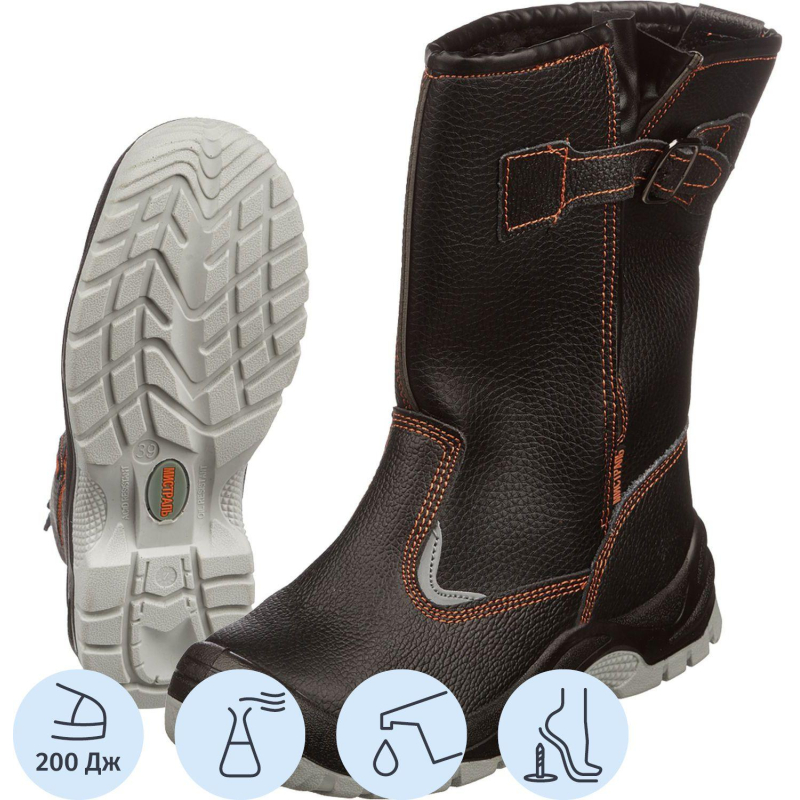 Сапоги модели Мистраль подойдут как для мужчин, так и для женщин. Выполнены в черном цвете. Размер 46. Обувь рекомендована к использованию в строительстве, озеленении территории, ЖКХ, промышленности, логистике, нефтегазовой промышленности. Рабочая обувь из натуральной кожи долговечна, устойчива к повреждениям, комфортна в носке. Утеплитель из искусственного меха хорошо держит тепло, рассчитан на температурные режимы до -20 °C в сухой среде. Противоударный металлический подносок защищает от ударов силой до 200 Дж. Полиуретановая с термополиуретаном подошва (ПУ+ТПУ) устойчива к воздействию химических факторов (нефть, масла, щелочь и кислота). Подошва обладает прекрасным сопротивлением к скольжению, устойчива к воздействию температур от -35 до 130 °C. Промежуточный слой из полиуретана придает подошве легкость, а ходовой слой из термополиуретана увеличивает срок службы за счет устойчивости к многократному изгибу, деформации и истиранию. Подошва обуви скреплена литьевым методом крепления. Данный метод обеспечивает надежное, герметичное крепление слоев подошвы, а значит, долгий срок службы и высокую гибкость, тем самым уменьшая усталость ног. Металлическая стелька защищает от проколов. Данная модель маслобензиностойкая. Защитные свойства обуви: Мун 200 (защита от ударов в носочной части энергией 200 Дж), Тн (защита от пониженных температур воздуха), З (защита от общих производственных загрязнений), а так же от кислот и щелочей. Гарантийный срок после выдачи обуви составляет 70 дней при соблюдении правил ухода, эксплутации и хранения. Соответствуют стандартам ТР ТС 019/2011. Цвет на изображении товара в интернет-магазине или в печатном каталоге может отличаться от оригинала из-за особенностей цветопередачи монитора.