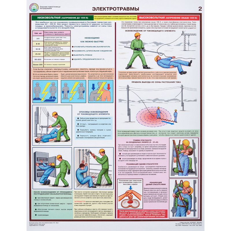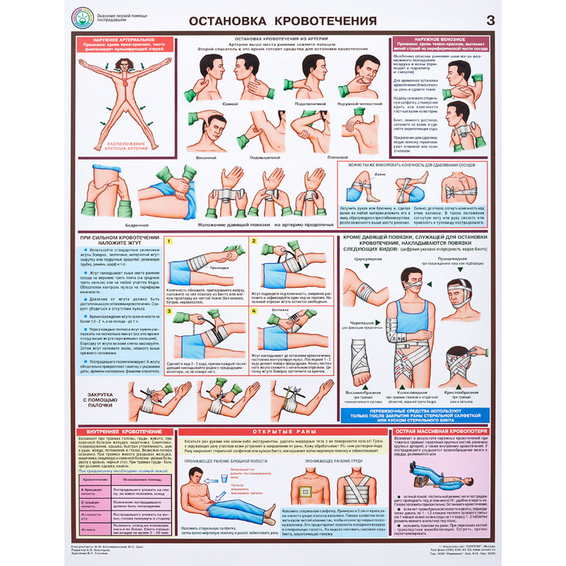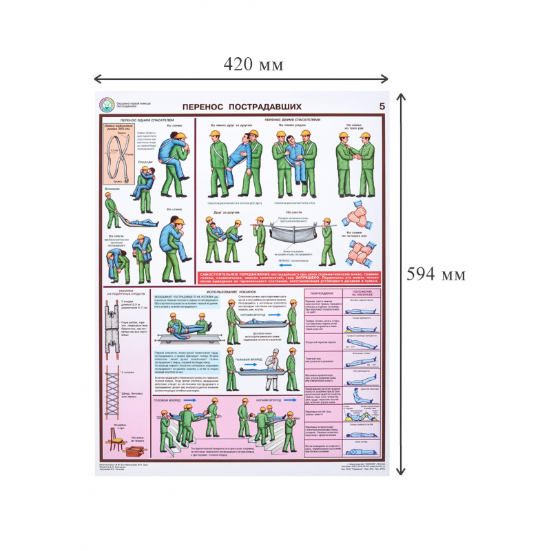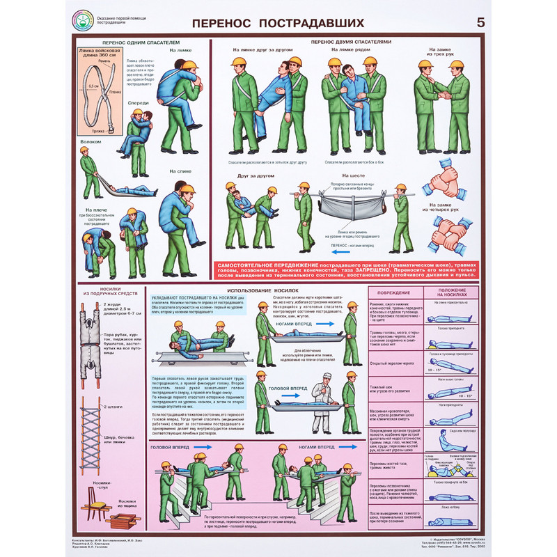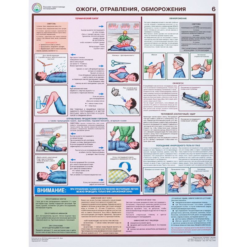 Плакат информационный по оказанию первой помощи пострадавшим. Наименование по ГОСТу: 'Оказание первой помощи пострадавшим'. Размер: 420x594 мм. В комплект входит 6 листов. 1. Перенос пострадавших 2. Транспортная иммобилизация 3. Остановка кровотечения 4. Электротравмы 5. Техника реанимации 6. Ожоги, отравления, обморожения Материал изготовления: бумага ламинированная. Страна происхождения: Российская Федерация.
