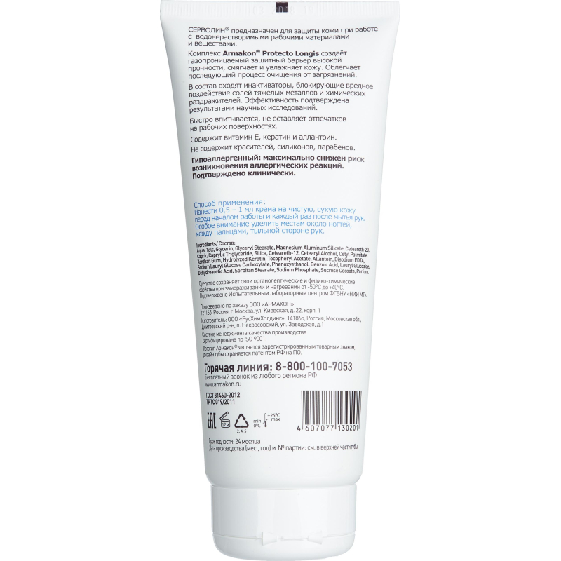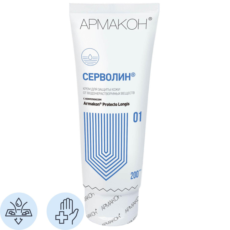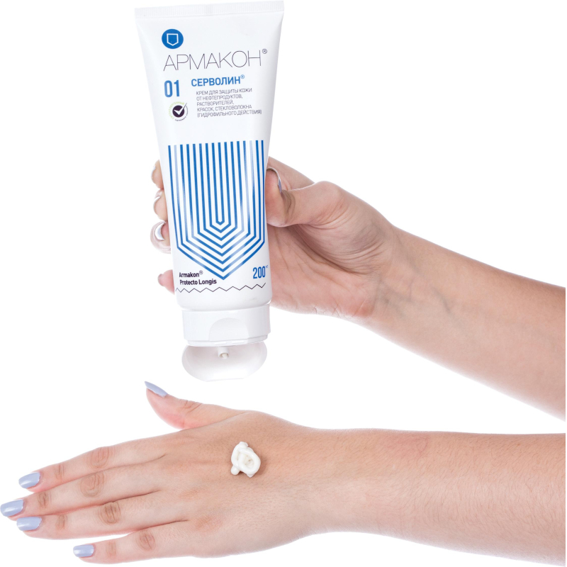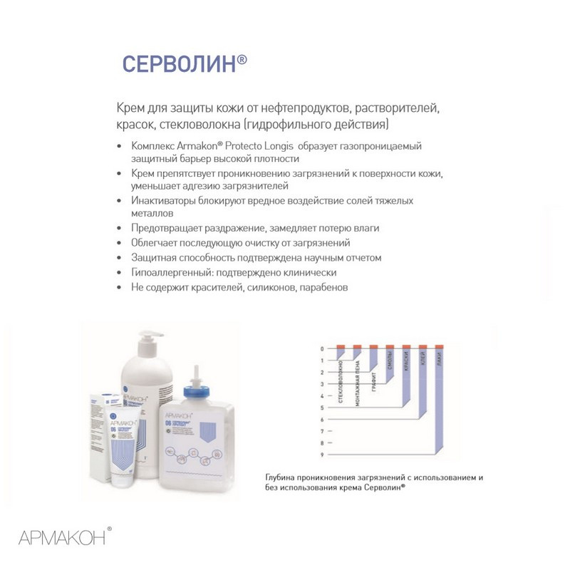 Защитный крем Армакон Серволин - крем для защиты кожи гидрофильного действия, направленный на предотвращение развития профессиональных дерматозов и снижение затрат на их лечение. Предназначен для защиты кожи при работе с нефтепродуктами, органическими растворителями, техническими маслами, смазками, сажей, лаками, красками, смолами, графитом, различными видами производственной пыли (угольной, металлической, стекольной), мазутом, стекловолокном и другими водонерастворимыми материалами и веществами. Комплекс Armakon Protecto Longis образует газопроницаемый защитный барьер высокой прочности, который препятствует проникновению водонерастворимых веществ к поверхности кожи и уменьшает адгезию загрязнителей с кожей. Содержит инактиваторы, блокирующие вредное воздействие химических раздражителей. Защитная способность подтверждена результатами научных исследований. В состав входят компоненты, ухаживающие за кожей (витамин Е, кератин, аллантоин). Витамин Е -антиоксидант, увлажняет кожу, стимулирует процесс регенерации тканей, активизирует тканевое дыхание, замедляет процесс формирования свободных радикалов и окисления липидов; кератин способствует восстановлению поврежденного защитного слоя кожи, смягчает. Гипоаллергенность подтверждена сертификационным центром Service Allergy Swiss (SAS, Швейцария). Крем быстро впитывается, не оставляет отпечатков на рабочих поверхностях. Не содержит красителей, силиконов, парабенов, формальдегид-производных. Условия хранения: избегать попадания прямых солнечных лучей. Упаковка: туба 200 мл. Срок годности от даты изготовления 24 месяца. Соответствует стандартам ТР ТС 019/2011, ГОСТ 31460-2012. Внимание! Произошло изменение дизайна упаковок производителем. В связи с этим изображения товаров на фотографиях, представленных на сайте, могут отличаться. Дизайн упаковки представлен в двух вариантах без возможности выбора. ЗАКЛЮЧЕНИЕ МИНПРОМТОРГА РФ ВЫ МОЖЕТЕ СКАЧАТЬ ЗДЕСЬ: