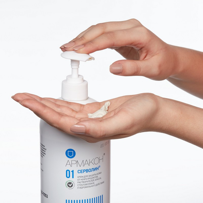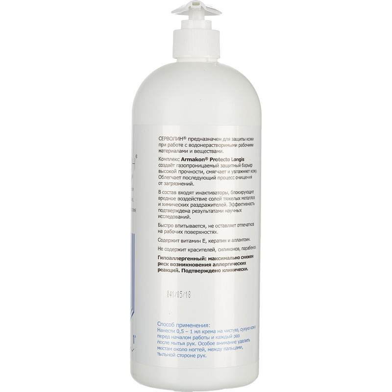 Защитный крем Армакон Серволин - крем для защиты кожи гидрофильного действия, направленный на предотвращение развития профессиональных дерматозов и снижение затрат на их лечение. Предназначен для защиты кожи при работе с нефтепродуктами, органическими растворителями, техническими маслами, смазками, сажей, лаками, красками, смолами, графитом, различными видами производственной пыли (угольной, металлической, стекольной), мазутом, стекловолокном и другими водонерастворимыми материалами и веществами. Комплекс Armakon Protecto Longis образует газопроницаемый защитный барьер высокой прочности, который препятствует проникновению водонерастворимых веществ к поверхности кожи и уменьшает адгезию загрязнителей с кожей. Содержит инактиваторы, блокирующие вредное воздействие химических раздражителей. Защитная способность подтверждена результатами научных исследований. В состав входят компоненты, ухаживающие за кожей (витамин Е, кератин, аллантоин). Витамин Е -антиоксидант, увлажняет кожу, стимулирует процесс регенерации тканей, активизирует тканевое дыхание, замедляет процесс формирования свободных радикалов и окисления липидов; кератин способствует восстановлению поврежденного защитного слоя кожи, смягчает. Гипоаллергенность подтверждена сертификационным центром Service Allergy Swiss (SAS, Швейцария). Крем быстро впитывается, не оставляет отпечатков на рабочих поверхностях. Не содержит красителей, силиконов, парабенов, формальдегид-производных. Соответствует ТР ТС 019/2011, ГОСТ 31460-2012. Упаковка: флакон 1000 мл. Условия хранения: избегать попадания прямых солнечных лучей. Срок годности от даты изготовления 24 месяцаВнимание! Произошло изменение дизайна упаковок производителем. В связи с этим изображения товаров на фотографиях, представленных на сайте, могут отличаться. Дизайн упаковки представлен в двух вариантах без возможности выбора. ЗАКЛЮЧЕНИЕ МИНПРОМТОРГА РФ ВЫ МОЖЕТЕ СКАЧАТЬ ЗДЕСЬ: