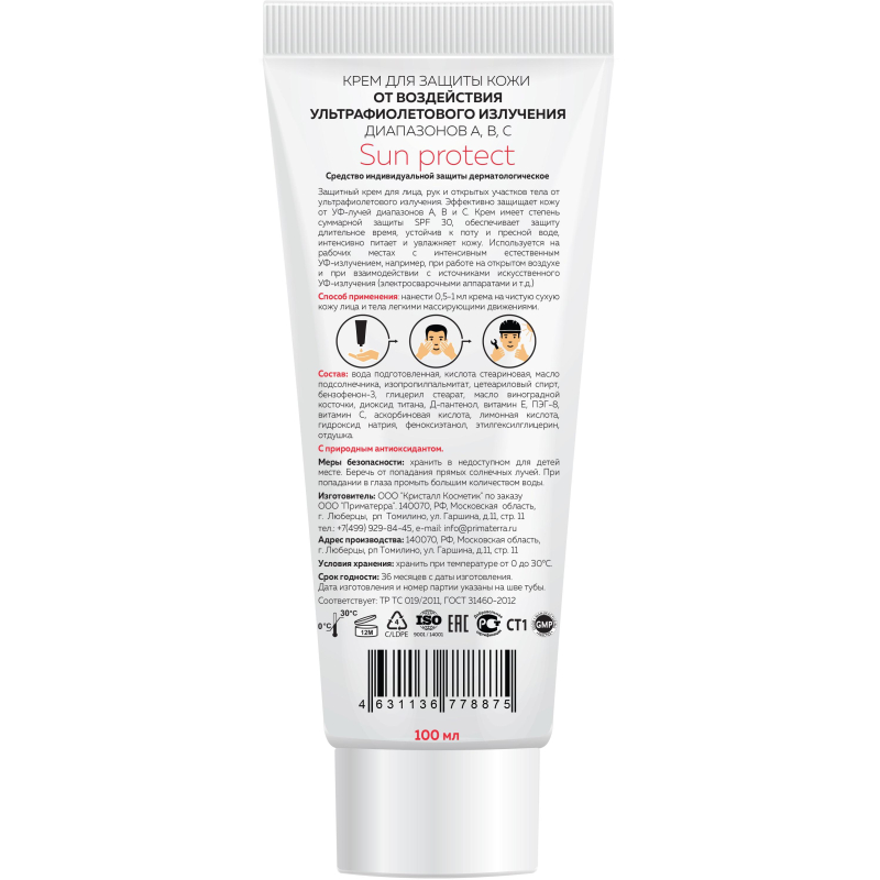 Крем защитный М Solo Sun protect для лица, рук и открытых участков тела от ультрафиолетового излучения. Эффективно защищает кожу от УФ-лучей диапазонов А, В и С. Свойства: степень суммарной защиты SPF 35; устойчив к поту и пресной воде; интенсивно питает и увлажняет кожу. Природный антиоксидант (масло виноградной косточки) усиливает УФ-защиту и замедляет процессы старения. Используется на рабочих местах с интенсивным естественным УФ-излучением, например, при работе на открытом воздухе или при взаимодействии с источниками искусственного УФ-излучения (электросварочными аппаратами и т.д.). Содержит D-пантенол, витамин Е и масло виноградной косточки, что способствует регенерации кожи, обладает антиоксидантными и увлажняющими свойствами. Нанести небольшое количество крема (0,5-1 мл) на чистую сухую кожу лица и тела легким массирующие движениями. Упаковка: туба 100 мл. Условия хранения: избегать попадания прямых солнечных лучей. Срок годности от даты изготовления 36 месяцев. Соответствует стандарту ТР ТС 019/2011. Не содержит вредных веществ - силиконов, минеральных абразивов, горючих и летучих органических растворителей по ТР ТС 019/2011 в части безопасности средств дерматологических. Крем относится к сегменту "эконом". Качество соответствует требованиям нормативных документов ТР ТС 019-2011, произведено в соответствии с ГОСТ 31460-2012. ЗАКОНОДАТЕЛЬНЫЕ И ТЕХНИЧЕСКИЕ ДОКУМЕНТЫ:
