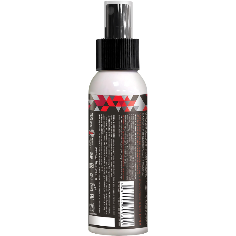 Спрей защитный Primaterra Insect от комаров и насекомых обеспечивает эффективную защиту от различных кровососущих насекомых (иксодовых клещей, комаров, москитов, слепней, мошек, мокрецов и т.п.) при нанесении на открытые участки тела, одежду. Защитная способность подтверждена результатами научных исследований. Спрей легко наносится, не оставляет следов на одежде. Сохраняет водный баланс в эпидермисе, способствует нормализации выработки сального секрета (масло мяты перечной). Не содержит красителей, силиконов и парабенов, которые являются сильными аллергенами. В состав входит ДЭТА 30%, который поддерживает максимальную эффективность реппелента в течение всего срока защитного действия: от насекомых при нанесении на кожу - до 4-х часов. При нанесении на одежду: от насекомых - до 30 суток, от клещей - до 5 суток. Упаковка: флакон 100 мл. Условия хранения: избегать попадания прямых солнечных лучей. Срок годности: 36 месяцев. Соответствует стандарту ТР ТС 019.2011.