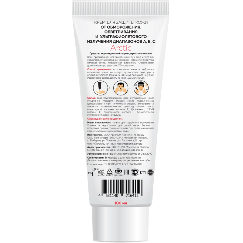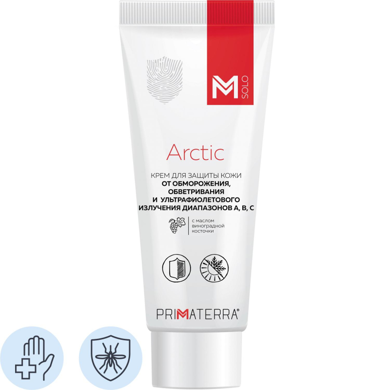 Крем защитный М SOLO Arctic предназначен для защиты кожи рук, лица и тела при неблагоприятных погодных условиях - низкие температуры, сильный ветер, повышенная влажность. Обеспечивает дополнительную защиту от УФ-излучения SPF35. Изготовлен на натуральных маслах, которые создают дышащий барьерный слой на коже. Натуральный барьерный слой не позволяет испаряться собственной влаге, что способствует улучшению сопротивляемости кожи, предотвращая ее огрубление и растрескивание даже при экстремально-низких температурах. Содержит комплекс витаминов Е, С и Д-пантенол которые способствуют регенерации кожи. Содержит в своем составе комбинацию физического и химического фильтров, эффективно защищающую от воздействия ультрафиолетового излучения диапазонов UV- А, UV-В, UV-С. Не содержит аллергенов. Расход средства 0,5-1 мл. Упаковка: 100 мл. Условия хранения: избегать попадания прямых солнечных лучей. Срок годности от даты изготовления: 36 месяцев. Соответствует стандартам ТР ТС 019/2011, ГОСТ 31460-2012. Крем относится к сегменту 'эконом'. Качество соответствует требованиям нормативных документов ТР ТС 019-2011, произведено в соответствии с ГОСТ 31460-2012. ЗАКОНОДАТЕЛЬНЫЕ И ТЕХНИЧЕСКИЕ ДОКУМЕНТЫ: