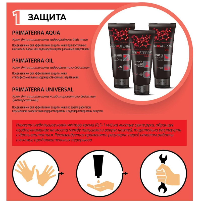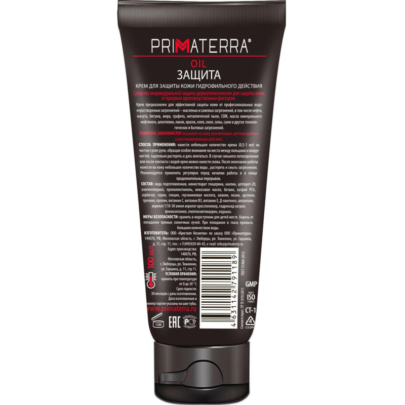 Крем защитный Primaterra Oil для рук гидрофильный 100 мл предназначен для эффективной защиты кожи от профессиональных водонерастворимых загрязнений - масляных и сажевых загрязнений, в том числе нефти, мазута, битума, жира, графита, металлической пыли, СОЖ, масла минерального нефтяного, шпатлевки, лаков, красок, клея, смол, золы, сажи и других технологических и бытовых загрязнений. Обладает ярко выраженными защитными свойствами. Образует защитный слой на коже, и при любом воздействии масложировых компонентов - прочно связывает их в эмульсию, не допуская проникновения в поры кожи. В своем составе имеет природный минерал - каолин, обладающий высокой адсорбционной способностью в отношении водонерастворимых компонентов (масляные и сажевые частицы, нефть, мазут, битум, жир, графити т. д.). Акриловый полимер в сочетании с эмульгаторами образует защитную пленку, препятствующую проникновению водонерастворимых соединений в поры кожи. Кокосовое масло смягчает кожу, комплекс аминокислот Prodew 400, оказывает увлажняющее действие. Витамины В3, С, Е, Д-пантенол и аллантоин обеспечивают антиоксидантное и регенерирующее действие. Крем легко наносится на кожу, не создает неудобства при работе, а после работы легко смывается. Содержит комплекс аминокислот, который: 1. Восстанавливает и сохраняет собственные защитные свойства кожи. 2. Составляет основу натурального увлажняющего фактора (НУФ; NMF). 3. Поддерживает должную пластичность кожи, защищая ее от повреждений. 4. Обеспечивает нормальную функцию гидролитических ферментов в процессе обновления клеток. Не содержит запрещенных, вредных компонентов. Расход 0,5-1 мл на одно применение. Условия хранения: избегать попадания прямых солнечных лучей. Срок годности 30 месяцев с даты изготовления/12 месяцев с момента вскрытия. Соответствует стандартам ТР ТС 019/2011, ГОСТ 31460-2012, СТ 1. Не содержит вредных веществ - силиконов, минеральных абразивов, горючих и летучих органических растворителей по ТР ТС 019/2011 в части безопасности средств дерматологических. ЗАКОНОДАТЕЛЬНЫЕ И ТЕХНИЧЕСКИЕ ДОКУМЕНТЫ: