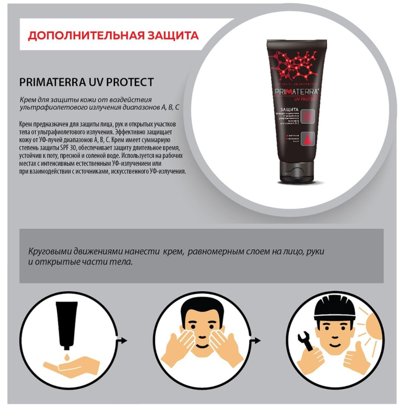 Крем защитный Primaterra UV Protect для лица и рук от УФ-излучения 100 мл предназначен для защиты лица, рук и открытых участков тела от ультрафиолетового излучения. Обеспечивает защиту длительное время, устойчив к поту, пресной и соленой воде. Используется на рабочих местах с интенсивным естественным УФ-излучением или при взаимодействии с источниками искусственного УФ-излучения. Защищает на протяжении всего диапазона УФ волн, за счет использования фильтров различной природы: органических, физических и натуральных масел. Благодаря входящим в его состав ультрафиолетовым фильтрам имеет суммарную степень защиты SPF 30 в диапазонахUV-А, UV-В и UV-С. Бутилметоксидибензоилметан (авобензон) - эффективный фильтр в диапазоне излучений UV-А, бензофенон-3 - эффективный фильтр в диапазоне излучений UV-А и UV-В, а диоксид титана и этилгексилметоксициннамат эффективны в диапазоне излучений UV-В и UV-С. Кокосовое масло и масло ши питают кожу, усиливая защитное действие крема. Комплекс аминокислот Prodew 400 оказывает увлажняющее действие. Витамины В3, С, Е, Д-пантенол и аллантоин обеспечивают антиоксидантное и регенерирующее действие. Крем легко наносится на кожу, не создает неудобства при работе. Аллантоин, комплекс Витаминов и Д-пантенол помогают восстановлению кожи после пребывания на солнце. Содержит комплекс аминокислот, который: 1. Восстанавливает и сохраняет собственные защитные свойства кожи. 2. Составляет основу натурального увлажняющего фактора (НУФ; NMF). 3. Поддерживает должную пластичность кожи, защищая ее от повреждений. 4. Обеспечивает нормальную функцию гидролитических ферментов в процессе обновления клеток. Масло Кокоса и масло Ши эффективно увлажняют кожу. При нанесении не оставляет ощущения липкости и жирного блеска. Не содержит запрещенных, вредных компонентов. Расход 0,5-1 мл на одно применение. Условия хранения: избегать попадания прямых солнечных лучей. Срок годности 30 месяцев с даты изготовления/12 месяцев с момента вскрытия. Соответсвуте стандартам ТР ТС 019/2011, ГОСТ 31460-2012, СТ 1. Не содержит вредных веществ - силиконов, минеральных абразивов, горючих и летучих органических растворителей по ТР ТС 019/2011 в части безопасности средств дерматологических. ЗАКОНОДАТЕЛЬНЫЕ И ТЕХНИЧЕСКИЕ ДОКУМЕНТЫ: