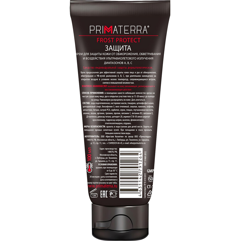 Крем защитный Primaterra Frost Protect SPF30 для лица и рук от низких температур 100 мл предназначен для эффективной защиты кожи лица и рук от обморожения, обветривания и УФ-лучей диапазонов, А, В, С, при длительном нахождении на открытом воздухе в условиях низких температур, сопровождающихся ветром, снегом и повышенной влажностью. Крем создан на основе натурального касторового масла. Касторовое масло имеет низкую температуру замерзания и не является пленкообразующим - не испаряется с поверхности кожи. Глицерин понижает температуру замерзания, предотвращая кристаллизацию воды в коже, а пчелиный воск, ланолин и сквалан создают тончайшую пленку на поверхности кожи, удерживая влагу внутри. Кофеин улучшает кровообращение в тканях, препятствует обморожению. Во избежание неблагоприятного воздействия на кожу ультрафиолетового излучения диапазонов, А, В и С (в том числе отраженного от снежного покрова) в состав крема входят защитные фильтры. Комплекс аминокислот Prodew 400 оказывает увлажняющее действие. Витамины В3, С, Е, Д-пантенол и аллантоин обеспечивают антиоксидантное и регенерирующее действие. Крем легко наносится на кожу, не создает неудобства при работе. Содержит комплекс аминокислот, который: 1. Восстанавливает и сохраняет собственные защитные свойства кожи. 2. Составляет основу натурального увлажняющего фактора (НУФ; NMF). 3. Поддерживает должную пластичность кожи, защищая ее от повреждений. 4. Обеспечивает нормальную функцию гидролитических ферментов в процессе обновления клеток. Легко наносится, имеет приятную текстуру. Не содержит запрещенных, вредных компонентов. Расход 0,5-1 мл на одно применение. Условия хранения: избегать попадания прямых солнечных лучей. Срок годности 30 месяцев с даты изготовления/12 месяцев с момента вскрытия. Соответствует стандаратм ТР ТС 019/2011, ГОСТ 31460-2012, СТ 1. Не содержит вредных веществ - силиконов, минеральных абразивов, горючих и летучих органических растворителей по ТР ТС 019/2011 в части безопасности средств дерматологических. ЗАКОНОДАТЕЛЬНЫЕ И ТЕХНИЧЕСКИЕ ДОКУМЕНТЫ: