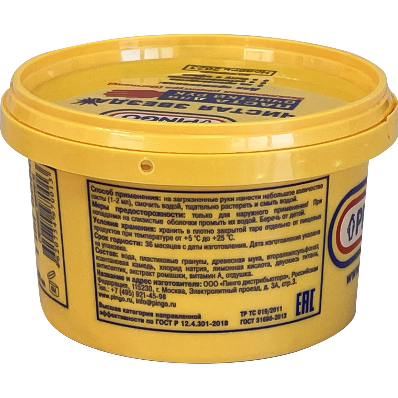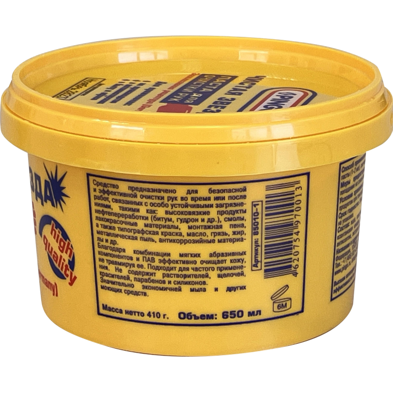 Паста для очистки рук предназначена для безопасной и эффективной очистки рук во время или после работ, связанных с особо устойчивыми загрязнениями, такими как: высоковязкие продукты нефтепереработки (битум, гудрон и др.), смолы, лакокрасочные материалы, монтажная пена, а также типографская краска, масло, грязь, жир, металлическая пыль, антикоррозийные материалы и др. Благодаря комбинации мягких абразивных компонентов и ПАВ эффективно очищает кожу, не травмируя ее, подходит для частого применения. Значительно экономичней мыла и других моющих средств. Не содержит растворителей, щелочей, красителей, парабенов и силиконов. Изготовлена по ГОСТ Р 31 696#2012 и соответствует требованиям ТР ТС 019/2011. Обладает высшей категорией направленной эффективности по ГОСТ Р 12.4.301#2018. Состав: вода, пластиковые гранулы, древесная мука, анионный ПАВ, ксантановая камедь, хлорид натрия, лимонная кислота, двуокись титана, антисептик, экстракт ромашки, витамин А, отдушка. Способ применения: на загрязненные руки нанести небольшое количество пасты (1-2 мл), смочить водой, тщательно растереть и смыть водой. Меры предосторожности: только для наружного применения! При попадании на слизистые оболочки промыть их водой. Беречь от детей. Условия хранения: хранить в плотно закрытой торе отдельно от пищевых продуктов при температуре от +5°С до +25°С. Срок годности: 3 года с даты изготовления. Дата изготовления указана на упаковке. Объем: 650 мл.