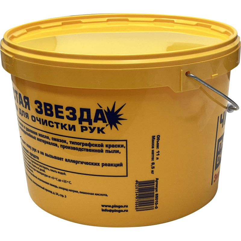 Паста для очистки рук Pingo Чистая Звезда с абразивом 11 л предназначена для безопасной и эффективной очистки рук во время или после работ, связанных с особо устойчивыми загрязнениями, такими как: высоковязкие продукты нефтепереработки (битум, гудрон и др.), смолы, лакокрасочные материалы, монтажная пена, а также типографская краска, масло, грязь, жир, металлическая пыль, антикоррозийные материалы и др. Благодаря комбинации мягких абразивных компонентов и ПАВ эффективно очищает кожу, не травмируя ее, подходит для частого применения. Значительно экономичней мыла и других моющих средств. Не содержит растворителей, щелочей, красителей, парабенов и силиконов. Изготовлена по ГОСТ Р 31 696#2012 и соответствует требованиям ТР ТС 019/2011. Обладает высшей категорией направленной эффективности по ГОСТ Р 12.4.301#2018. Состав: вода, пластиковые гранулы, древесная мука, анионный ПАВ, ксантановая камедь, хлорид натрия, лимонная кислота, двуокись титана, антисептик, экстракт ромашки, витамин А, отдушка. Способ применения: на загрязненные руки нанести небольшое количество пасты (1-2 мл), смочить водой, тщательно растереть и смыть водой. Меры предосторожности: только для наружного применения! При попадании на слизистые оболочки промыть их водой. Беречь от детей. Условия хранения: хранить в плотно закрытой торе отдельно от пищевых продуктов при температуре от +5°С до +25°С. Срок годности: 3 года с даты изготовления. Дата изготовления указана на упаковке. Объем: 11 л.
