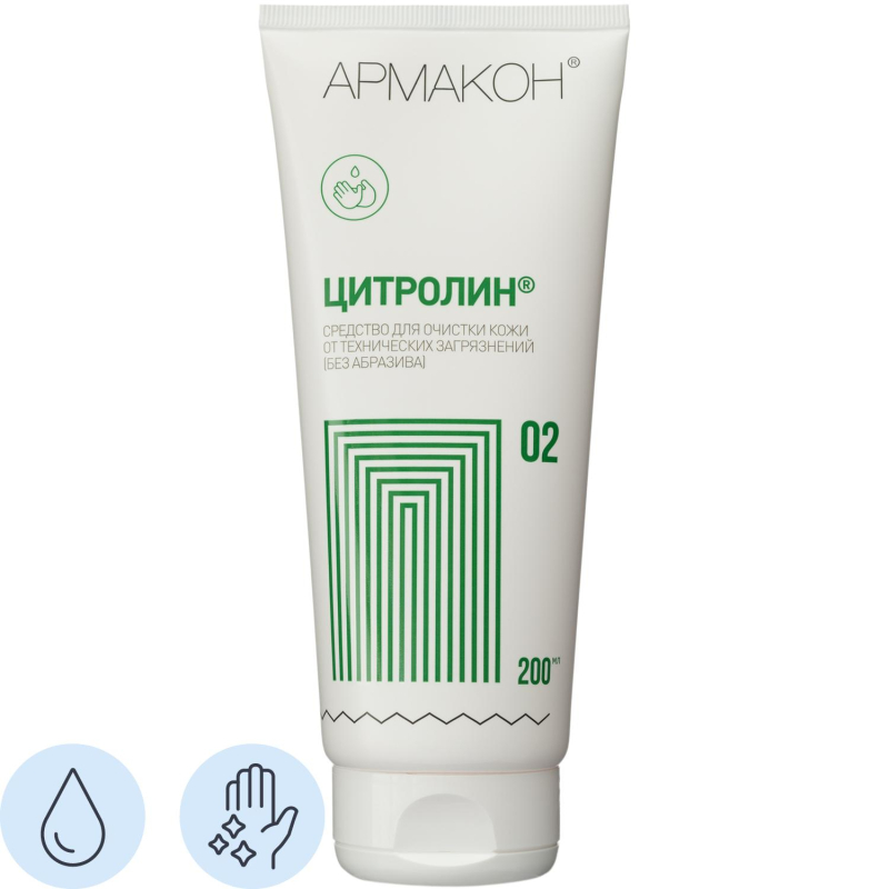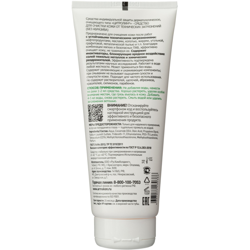 Очищающий гель Армакон Цитролин представляет собой средство для очистки кожи от технических загрязнений, не содержит абразива и позволяет легко удалить загрязнения технического характера (нефтепродуктов, масел, копоти, жира, угольной, графитовой, металлической пыли) с кожи рук. Благодаря комбинации мягких и безопасных ПАВ, средство наносится эффективно очищает кожу, не травмируя ее. Содержит инактиваторы, нейтрализующие вредное воздействие солей тяжелых металлов и химических раздражителей. Эффективность подтверждена научными исследованиями. Эффективно в воде любой жесткости; возможно применение без воды. Применим повсеместно при работах в условиях сильного загрязнения трудноудаляемыми материалами для обеспечения эффективной, бережной очистки кожи. Широко используется в машиностроении, железнодорожном транспорте, добыче полезных ископаемых (угля, нефти, газа, руды и т.д.), автотранспортных предприятиях, химическом производстве и так далее. С помощью средства Цитролин возможна эффективная очистка кожи без использования воды, достаточно удалить грязь салфеткой или ветошью. Средство подходит для частого использования. Обладает приятным ароматом. В состав включены увлажняющие и ухаживающие компоненты (олеиновая кислота, пропилен гликоль, ланолин). Не содержит растворителей, щелочей, абразивов, красителей, парабенов. Не добавляя воды нанести на руки небольшое количество (1-2 мл.) средства Цитролин. Хорошо втереть в течение 20 секунд, уделяя Особое внимание местам, где грязь въелась в кожу. Добавить небольшое количество воды (4-5 мл) и снова растереть в течение 20 секунд. Смыть водой или удалить загрязнения ветошью. Соответствует стандартам ТР ТС 019/2011, ГОСТ 31696-2012. Упаковка: туба 200 мл. Условия хранения: избегать попадания прямых солнечных лучей. Срок годности от даты изготовления 24 месяца. Внимание! Произошло изменение дизайна упаковок производителем. В связи с этим изображения товаров на фотографиях, представленных на сайте, могут отличаться. Дизайн упаковки представлен в двух вариантах без возможности выбора. ЗАКЛЮЧЕНИЕ МИНПРОМТОРГА РФ ВЫ МОЖЕТЕ СКАЧАТЬ ЗДЕСЬ: