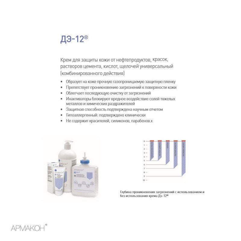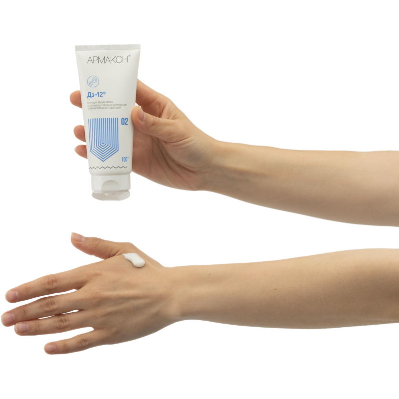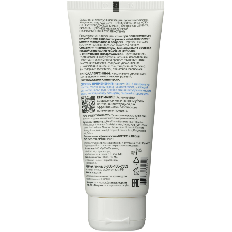 Универсальный защитный крем Армакон Дэ-12 предназначен для защиты кожи от нефтепродуктов, красок, растворов цемента, кислот, щелочей. Защитный крем комбинированного действия предназначен для защиты кожи при попеременном воздействии водорастворимых (водных растворов кислот, щелочей, извести, цемента, дезинфицирующих средств, удобрений) и водонерастворимых (растворителей, технических масел, красок, нефтепродуктов) материалов и веществ. Образует на коже прочную газопроницаемую защитную пленку. Специально подобранная сбалансированная комбинация компонентов (акрилат сополимер, тальк, жидкий парафин, петролатум) препятствует проникновению загрязнителей к поверхности кожи. Содержит инактивары, нейтрализующие вредное воздействие солей тяжелых металлов и химических раздражителей. Формула крема включает и дополнительный уход за кожей: глицерин аккумулирует влагу из воздуха и насыщает ею кожу; аллантоин - противовоспалительное и антибактериальное вещество, препятствует закупориванию пор. Гипоаллергенный: максимально снижен риск возникновения аллергических реакций. Подтверждено клинически. Использование защитного крема направлено на предотвращение возникновения профессиональных дерматитов и снижение затрат на их лечение. Быстро впитывается, оказывает увлажняющее действие на кожу, облегчает последующий процесс очищения. Защитная способность подтверждена результатами научных исследований. Не содержит красителей, силиконов, парабенов, формальдегид-производных. Соответствует стандартам ТР ТС 019/2011, ГОСТ 31460-2012. Условия хранения: избегать попадания прямых солнечных лучей. Упаковка: туба 100 мл. Срок годности от даты изготовления 24 месяца. Внимание! Произошло изменение дизайна упаковок производителем. В связи с этим изображения товаров на фотографиях, представленных на сайте, могут отличаться. Дизайн упаковки представлен в двух вариантах без возможности выбора. ЗАКЛЮЧЕНИЕ МИНПРОМТОРГА РФ ВЫ МОЖЕТЕ СКАЧАТЬ ЗДЕСЬ: