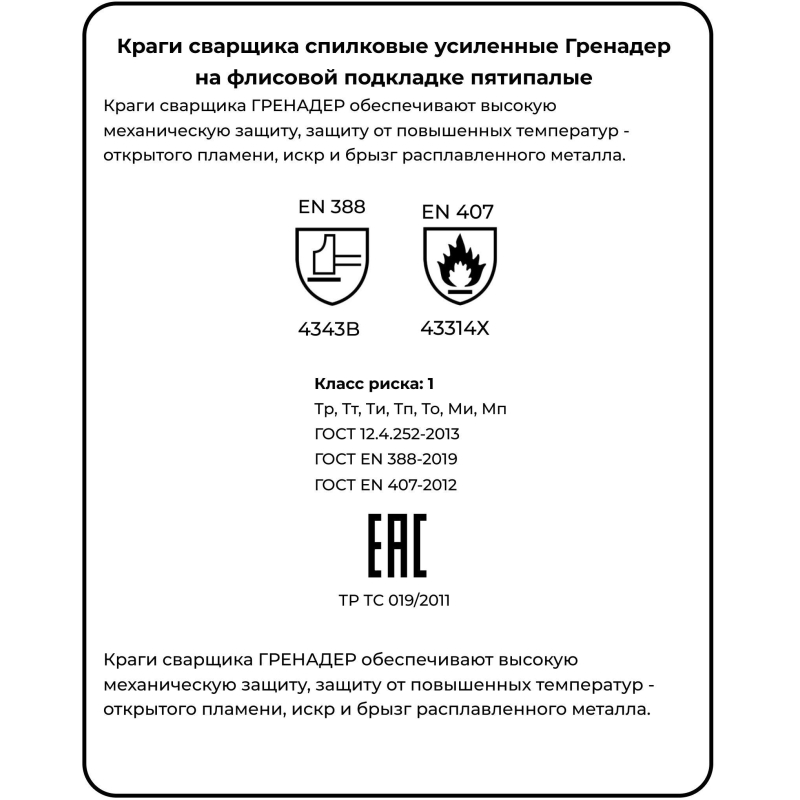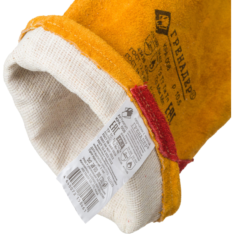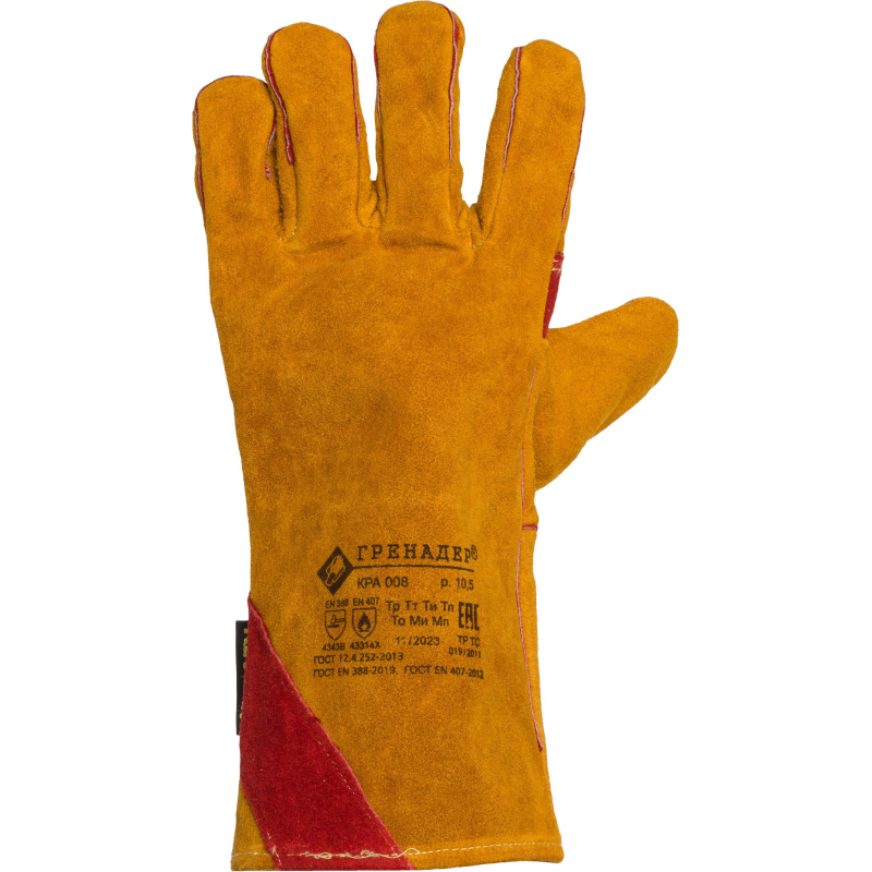 Краги спилковые Гренадер пятипалые желтые предназначены для защиты рук от механического воздействия, искр и брызг расплавленного металла и работ в условиях повышенных температур. Швы - нить Кевлар, усилены кожаными вставками. Ладонная часть и большой палец усилены накладками из спилка. Материал: спилок шлифованный кожевенный КРС, сорт АВ. Подкладка: флис. Размер - 10,5 (XL) . Цвет на изображении товара в интернет-магазине или в печатном каталоге может отличаться от оригинала из-за особенностей цветопередачи монитора.