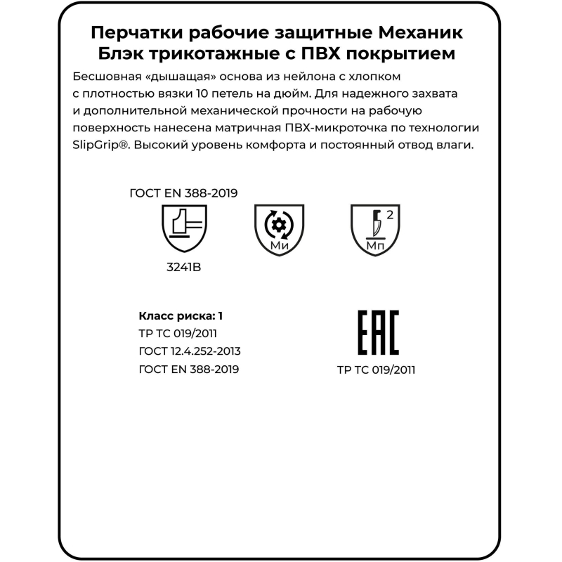 Перчатки защитные Механик Блэк нейлоновые с ПВХ покрытием TNG-30, предназначены для защиты рук от механических повреждений. Перчатки черного цвета, размер: 9. Сфера применения: общепроизводственные работы. Бесшовная ?дышащая? основа из нейлона с хлопком с плотностью вязки 10 петель на дюйм. Высокий уровень комфорта и постоянный отвод влаги. Точка ПВХ, нанесенная по специальной технологии, обеспечивает превосходные сцепные свойства и дополнительная стойкость к истиранию. Максимальная износоустойчивость и чистота продукта. Превосходные сцепные свойства и дополнительная стойкость к истиранию. Двойной оверлок с цветовой индикацией размера. В 15 раз долговечнее стандартных х/б перчаток. Длина, мм: 250. Вес пары, г: 42. Количество пар в упаковке: 1. Количество упаковок в транспортном коробе: 140. Маркировка: EN-3241В и ТР ТС - Ми, Мп. Соответствует ТР ТС 019/2011, ГОСТ 12.4.252-2013, ГОСТ EN 388-2019 Защитные свойства ТР ТС: защита от истирания, от проколов и порезов. Цвет на изображении товара в интернет-магазине или в печатном каталоге может отличаться от оригинала из-за особенностей цветопередачи монитора.