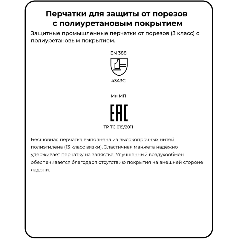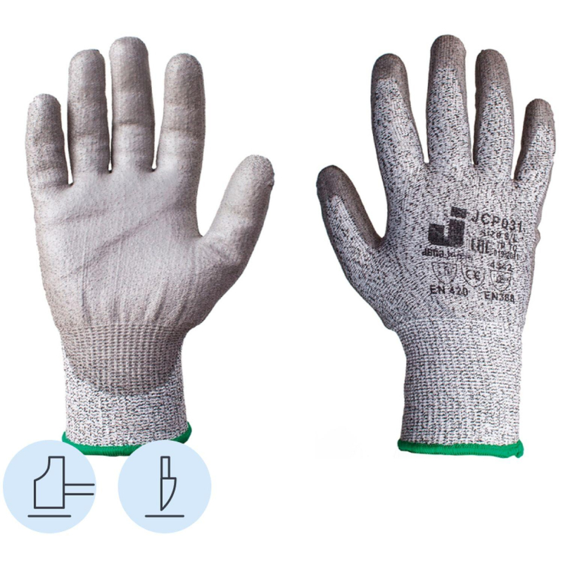 JCP031 Промышленные трикотажные перчатки для защиты от порезов (3 класс) из синтетической пряжи (полиэтилен) с полиуретановым покрытием ладони, цвет серый, размер 9(L). Стандарты: ГОСТ 12.4.252-2013, ГОСТ EN 388-2019, ГОСТ EN ISO 21420-2020, ТР ТС 019/2011. Бесшовная перчатка из высокопрочных нитей полиэтилена. 13 класс вязки. Эластичная манжета для надежного удержания на запястье. Тыльная сторона ладони без покрытия - позволяет коже дышать. Полиуретановое покрытие на ладони и пальцах устойчиво к работе с жирными и масляными деталями. Высокая стойкость к износу. Количество в упаковке - 1 пара. Количество упаковок в транспортном коробе - 48. Сфера применения: металлообработка, работа с абразивами, авторемонт, сборка и пусконаладка оборудования, работа с инструментом. Отрасли: строительство, жкх, общепромышленные работы. Условия рабочей среды: сухие условия. Цвет на изображении товара в интернет-магазине или в печатном каталоге может отличаться от оригинала из-за особенностей цветопередачи монитора.