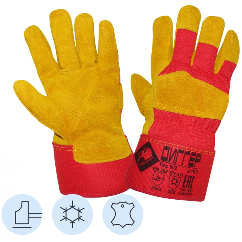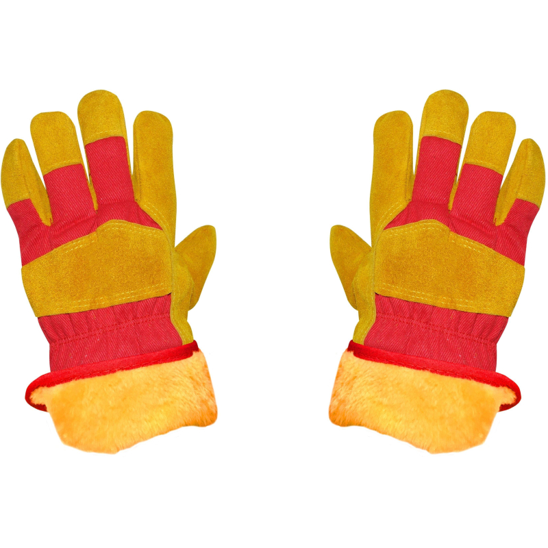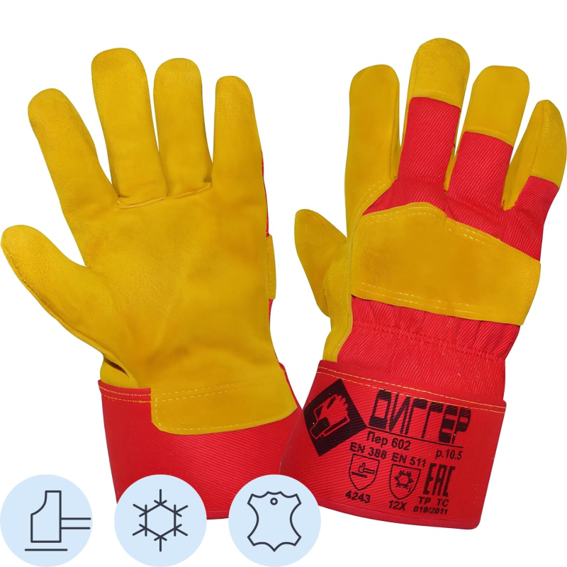 Перчатки рабочие, утепленные Диггер комбинированные красные/желтые (размер 10.5). Перчатки выполнены из высококачественного спилка КРС и плотной смесовой ткани. Спилок коровий сорта АВ. Утеплитель - искусственный мех. Двойные швы. Предназначены для защиты от механических воздействий в условиях пониженных температур, для использования на общепроизводственных работах. Высокая стойкость к истиранию и разрыву. Рекомендованы для продолжительного ношения. Сфера применения: ЖКХ, строительство и ремонт. Материал: спилок КРС толщиной 1.4 мм (+/- 0.1мм), смесовая ткань 230 г/куб.м. Утеплитель: искусственный мех желтого цвета плотностью 750 г/кв.м. Манжет: жесткая прорезиненная крага. Длина: 27 см. Количество пар в упаковке: 1. Соответствуют стандартам: ТР ТС 019/2011, ГОСТ 12.4.252-2013, ГОСТ EN 388-2012, ГОСТ EN 511-2012. Цвет на изображении товара в интернет-магазине или в печатном каталоге может отличаться от оригинала из-за особенностей цветопередачи монитора.