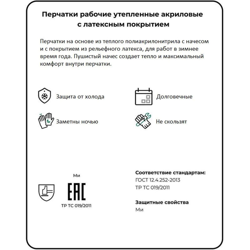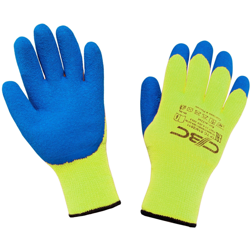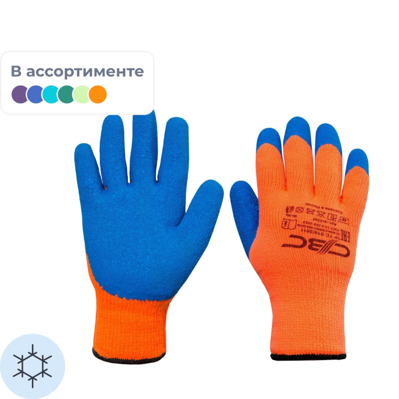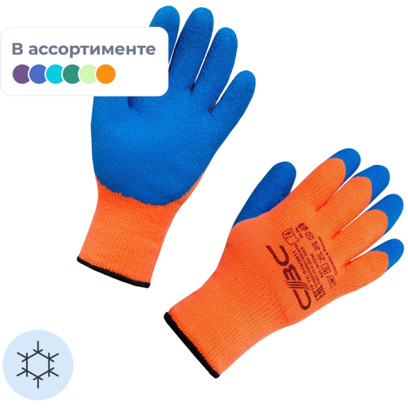 Перчатки защищают руки от холода при температуре до -30 °С. Ручной оверлок, вес 108 г. Состав: основа - акрил 100%, покрытие - латекс 100%. Ворс внутри перчатки начесан специальным образом для повышения теплоизоляционных свойств. Рельефная отделка покрытия обеспечивает надежный захват при работе со скользкими, замасленными, мокрыми поверхностями. Перчатки оптимальны для работы со стеклом и режущими материалами, для укладки брусчатки. Толщина: 3 мм. Длина: 260 (плюс-минус 5) мм. Максимальный срок эксплуатации (службы) изделия - до физического износа. Внимание! Перчатки поставляются в нескольких вариантах цвета без возможности выбора. Цвет на изображении товара в интернет-магазине или в печатном каталоге может отличаться от оригинала из-за особенностей цветопередачи монитора. ЗАКОНОДАТЕЛЬНЫЕ И ТЕХНИЧЕСКИЕ ДОКУМЕНТЫ: