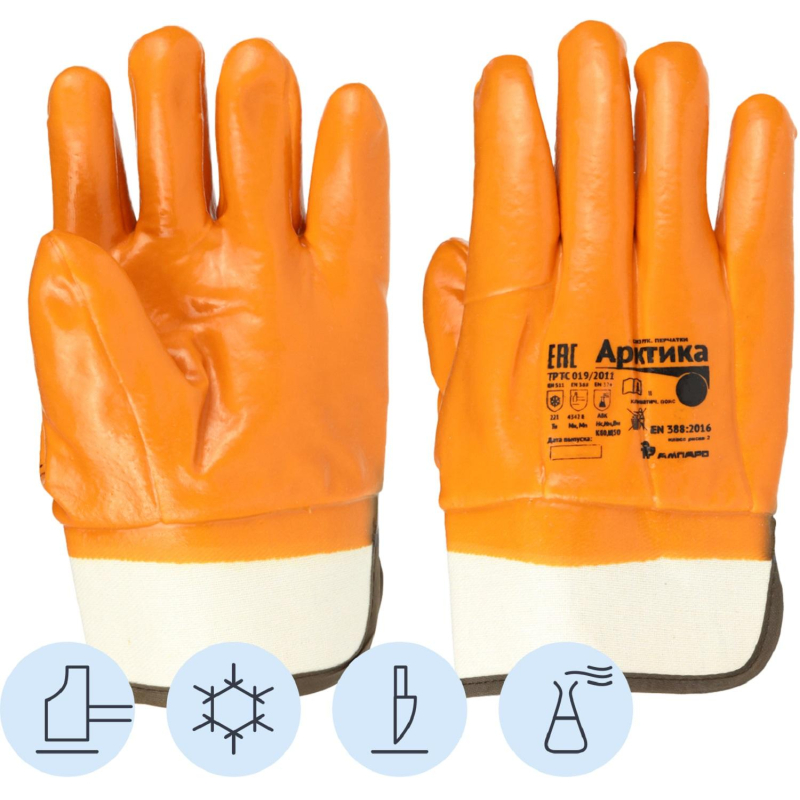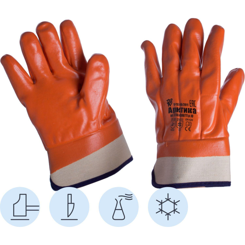 Перчатки утепленные Арктика с манжетой-крагой. Основа перчаток: утепленный х/б трикотаж, дублированный поролоном. Покрытие: ПВХ. Толщина подкладки 4 мм. Перчатки предназначены для защиты от низких температур, масел, нефти и нефтепродуктов, механических воздействий в условиях пониженных температур. Водонепроницаемы. Морозостойкость покрытия: до -50С. Морозостойкость эксплуатационная: до -20С. Размер: 10 (XL). Цвет на изображении товара в интернет-магазине или в печатном каталоге может отличаться от оригинала из-за особенностей цветопередачи монитора.
