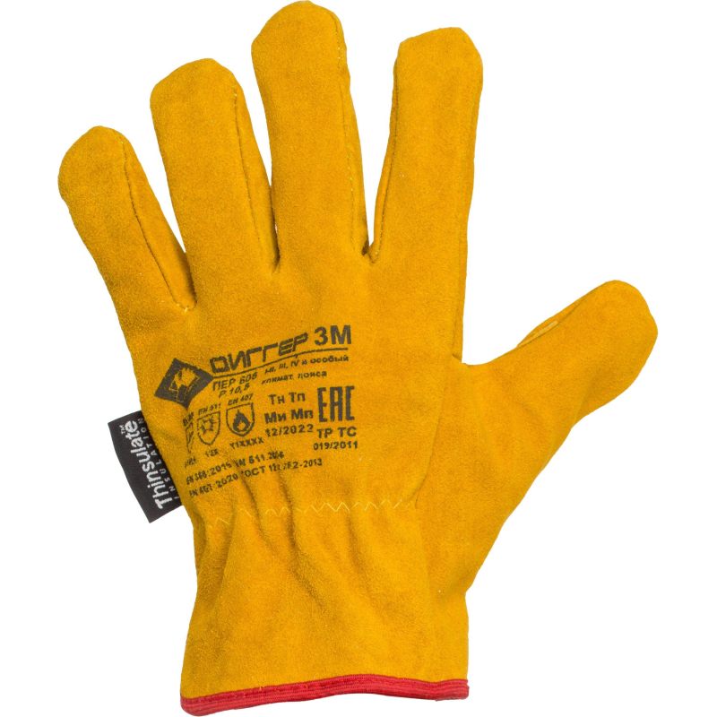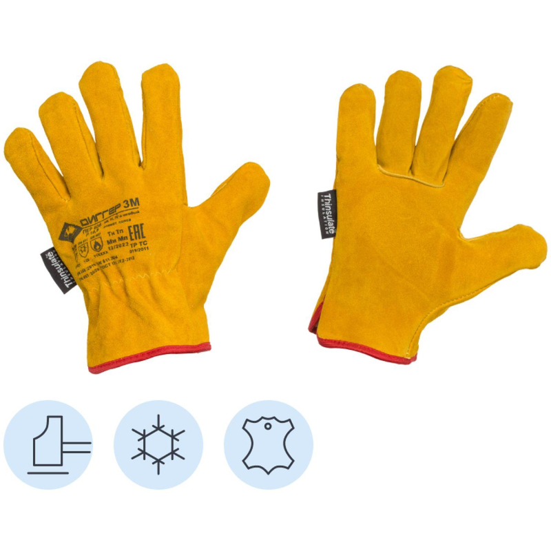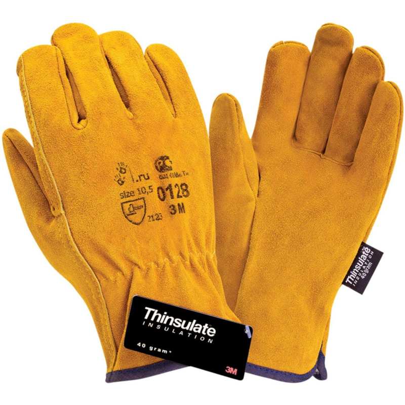 Перчатки из высококачественного спилка КРС. Спилок коровий, мягкий, сорта, А. Утеплитель Thinsulate 40 °C (Тинсулейт 40 г/м2) отличается значительно меньшей толщиной в сравнении с мехом, но не уступает в защитных свойствах, обеспечивая лучшую чувствительность. Двойные швы. На запястье резинка. Предназначены для защиты от механических воздействий в условиях пониженных температур, в том числе для удобства манипулирования. Имеют высокую износостойкость. Рекомендованы для работы с инструментом, для ИТР, для водителей. Материал: спилок КРС толщиной 1,4 мм (+/- 0,1 мм) Утеплитель: Тинсулейт 40 г/м2. Длина: 27 см. Размер: 10.5. Упаковка: 1/10/60. Соответствуют стандартам: ТР ТС 019/2011, ГОСТ 12.4.252-2013, ГОСТ EN 388-2012, ГОСТ EN 511-2012. Внимание! Перчатки доступны в двух вариантах дизайна без возможности выбора. Цвет на изображении товара в интернет-магазине или в печатном каталоге может отличаться от оригинала из-за особенностей цветопередачи монитора.