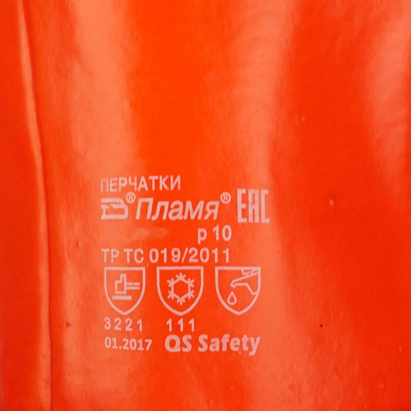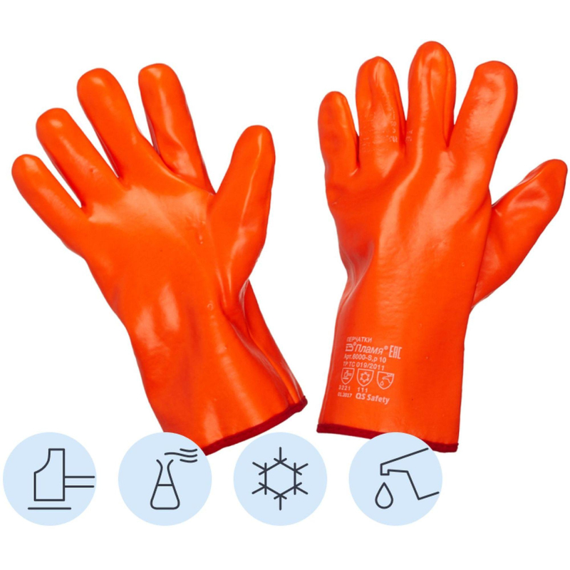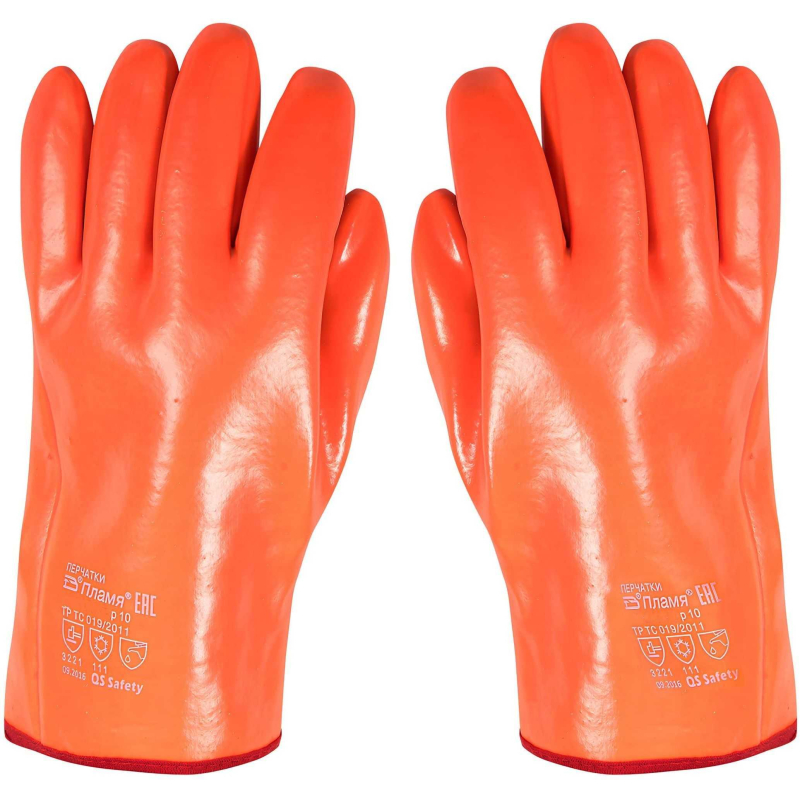Ператки трикотажные Пламя с полным ПВХ покрытием, размер 10 (XL). Манжета - раструб. Утепленные хлопчатобумажной тканью с начесом и вспененным полиуретаном. Перчатки имеют второй класс защиты от пониженных температур до -50°C, проколов и порезов, механических повреждений, воды, химических веществ (нефти, нефтепродуктов и масел, неконцентрированных растворов неорганичестких кислот концентрацией до 50% и щелочей концентрацией до 30%). Соответствует стандартам: ГОСТ EN 388-2019, ГОСТ EN ISO 374-1-2018, ГОСТ EN ISO 374-5-2017, ГОСТ EN 511-2012, ГОСТ 12.4.183-91. Цвет на изображении товара в интернет-магазине или в печатном каталоге может отличаться от оригинала из-за особенностей цветопередачи монитора.
