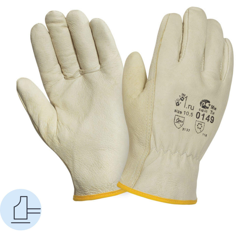 Перчатки рабочие утеплённые кожаные бежевые (размер 10.5, XL)Перчатки изготовлены из светлой высококачественной кожи бежевого цвета и предназначены для защиты рук от механических воздействий и пониженных температур. Материал основы - свиная кожа сорта АВ специальной выделки толщиной 1,0 мм (+/- 0,2 мм), которая обеспечивает высокую стойкость к истиранию и механическим нагрузкам. Утеплитель выполнен из искусственного меха плотностью 450 г/кв.м. В упаковке одна пара.На запястье предусмотрена резинка, обеспечивающая удобную посадку и дополнительную защиту от холода. Конструкция перчаток разработана с учётом свободы движений руки и пальцев. Они рекомендованы для работы с инструментами, а также для водителей, которым важна чувствительность и надёжный захват.Перчатки подходят для использования в строительстве, сфере ЖКХ, ремонте и при вождении транспорта. Они обеспечивают защиту от острого прокола (ОПЗ), истирания, порезов и низких температур. Рабочая поверхность не имеет дополнительного покрытия. Изделия не поддерживают работу с сенсорными экранами и не обладают антистатическими свойствами.Стандарты: ТР ТС 019/2011, ГОСТ 12.4.252-2013.Внешний вид и/или характеристики товара могут быть изменены производителем в соответствии с производственным процессом.