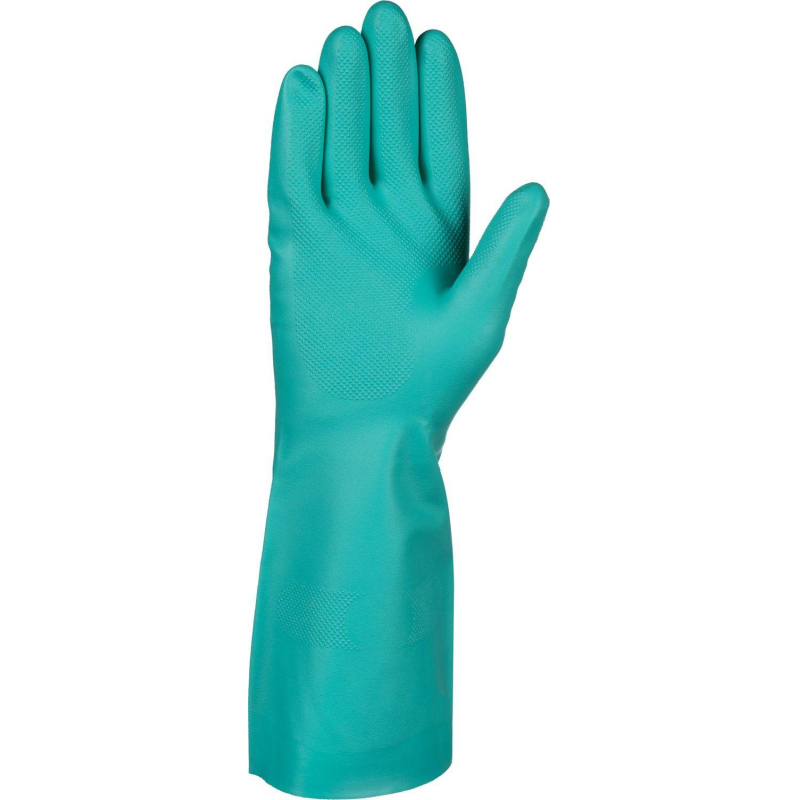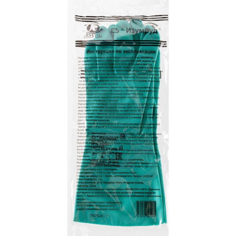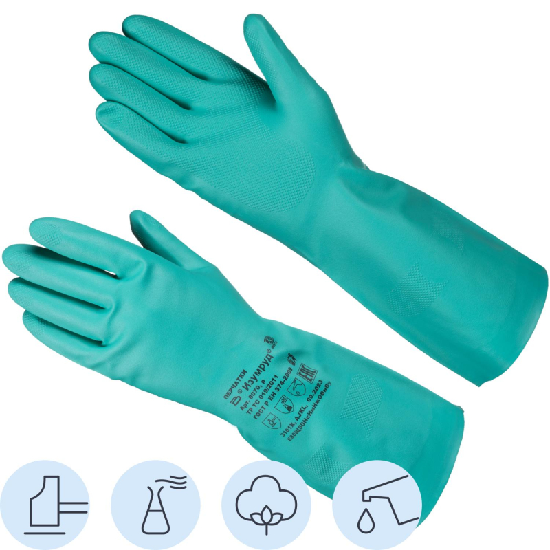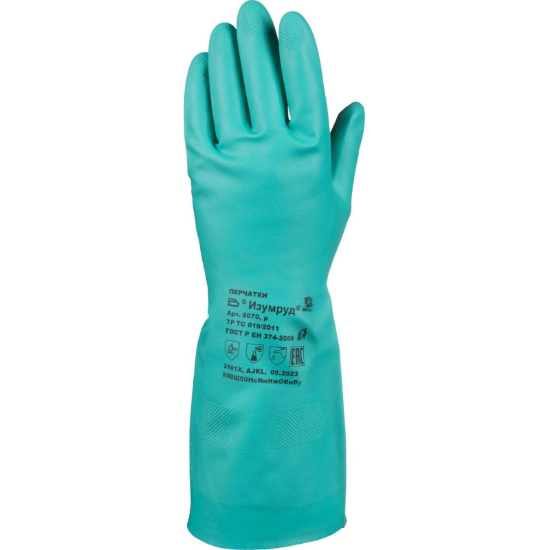 Перчатки Изумруд 8070 из нитрила с хлопковым внутренним напылением. Обеспечивают защиту рук от растворов кислот (до 80%), щелочей (до 50%) и механический воздействий. Размер 10 или XL. Толщина 0,38 мм. Вес пары: 77 г. Длина 33 см. Тип манжеты: удлиненный. Поверхность области захвата рельефная. Цвет: зеленый. Перчатки Изумруд 8070 применяются при высокой концентрации агрессивных сред. Количество в упаковке: 1 пара. Количество упаковок в транспортном коробе: 120. Соответствуют стандартам: ТР ТС 019/2011, ГОСТ 12.4.252-2013, ГОСТ ISO 374-1-2018. Срок хранения: 5 лет. Цвет на изображении товара в интернет-магазине или в печатном каталоге может отличаться от оригинала из-за особенностей цветопередачи монитора.