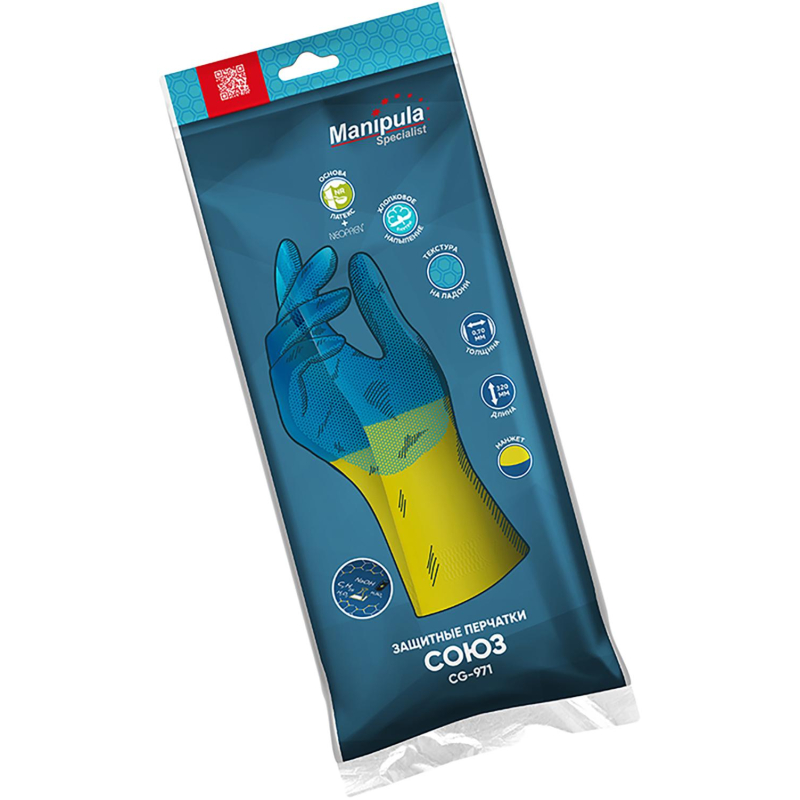 Перчатки КЩС латекс/неопрен Manipula Specialist Союз LN-F-05/СG-971 синие/желтые (размер 9-9,5, XL). Двухслойные герметичные перчатки из латекса и неопрена с надежной защитой от широкого спектра химических веществ, имеют высокую устойчивость к моющим средствам. Рекомендованы для защиты рук от химических факторов (воды, кислот концентрацией до 80%, щелочей до 50%, органических растворителей (этанол, ацетон), нефти и нефтепродуктов (минеральных масел), растительных жиров), микроорганизмов и механических воздействий (истирание). Неопреновая поверхность увеличивает механическую прочность, а также сохраняет гибкость и эластичность в холодных условиях. Плотное хлопковое покрытие на внутренней поверхности для удобства надевания и использования, снижения аллергических реакций на латексные протеины, а также комфортной термоизоляции. Текстура рабочей поверхности 'соты' обеспечивает отличный сухой и влажный захват. Безопасны для контакта с пищевыми продуктами (имеется экспертное заключение о соответствии продукции единым санитарно-эпидемиологическим и гигиеническим требованиям). Модель толщиной 0,7 мм используется в авиационной и химической промышленности. Длина перчаток 32 см. Вес пары: 117 г. Срок хранения: 5 лет. Перчатки являются большемерными, размер перчаток - 9-9,5 (XL). Соответствует стандартам: - ТР ТС 019/2011; - ГОСТ 12.4.252-2013; - EN 388:2016; - EN ISO 374-1:2016/Type A; - EN ISO 374-5:2016; - Регламент (ЕС) №1935/2004. Цвет на изображении товара в интернет-магазине или в печатном каталоге может отличаться от оригинала из-за особенностей цветопередачи монитора.