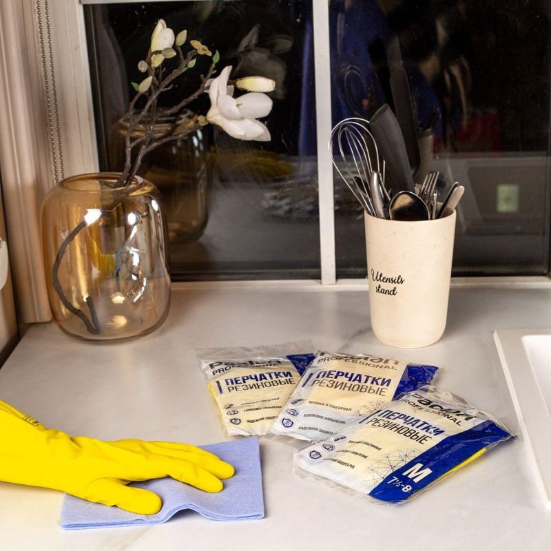 Перчатки латексные Paclan Professional с хлопковым напылением желтые (размер 7, S). Манжета - закатанный край. Толщина манжеты: 0.299 мм. Толщина ладони: 0.368 мм. Толщина пальцев: 0.368 мм. Предназначены для использования во время уборки, стирки, садовых работ, очистки посуды от сложных загрязнений, мытья автомобиля и прочих хозяйственных работ. Надежно защищают руки от воздействия вредных моющих веществ, попадания краски, грязи, влаги и т. д. Резиновые перчатки поставляются в мягкой упаковке. Вес пары - 46 г. Количество в упаковке 1 пара. Количество упаковок в транспортном коробе 5. Цвет на изображении товара в интернет-магазине или в печатном каталоге может отличаться от оригинала из-за особенностей цветопередачи монитора.