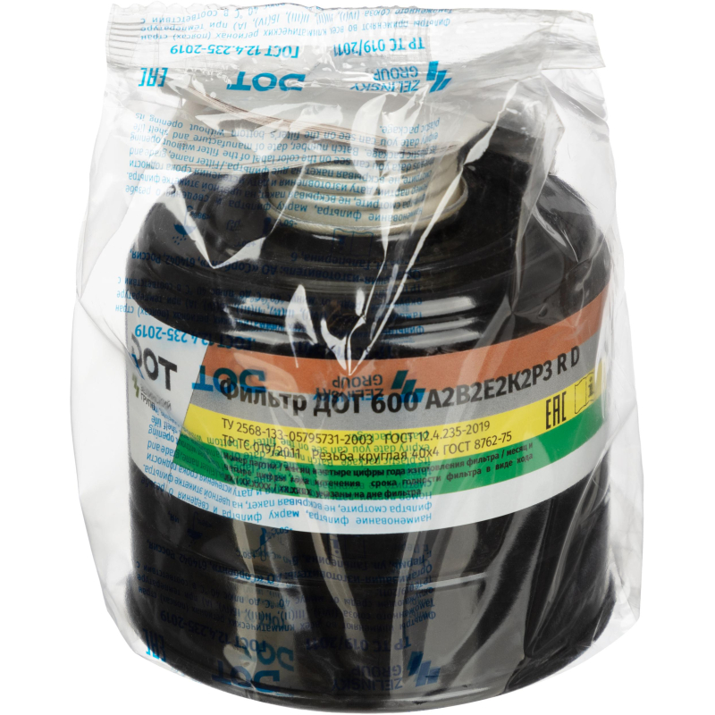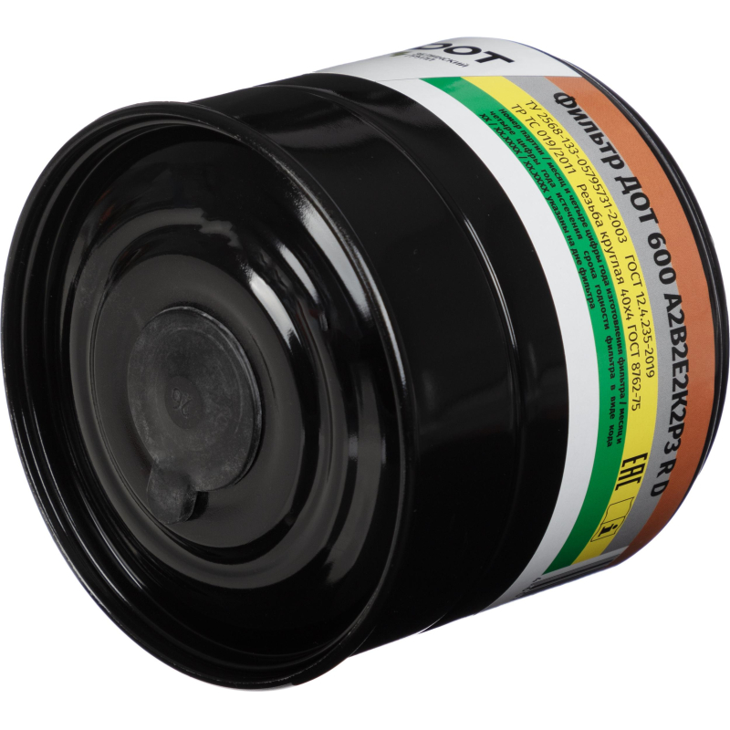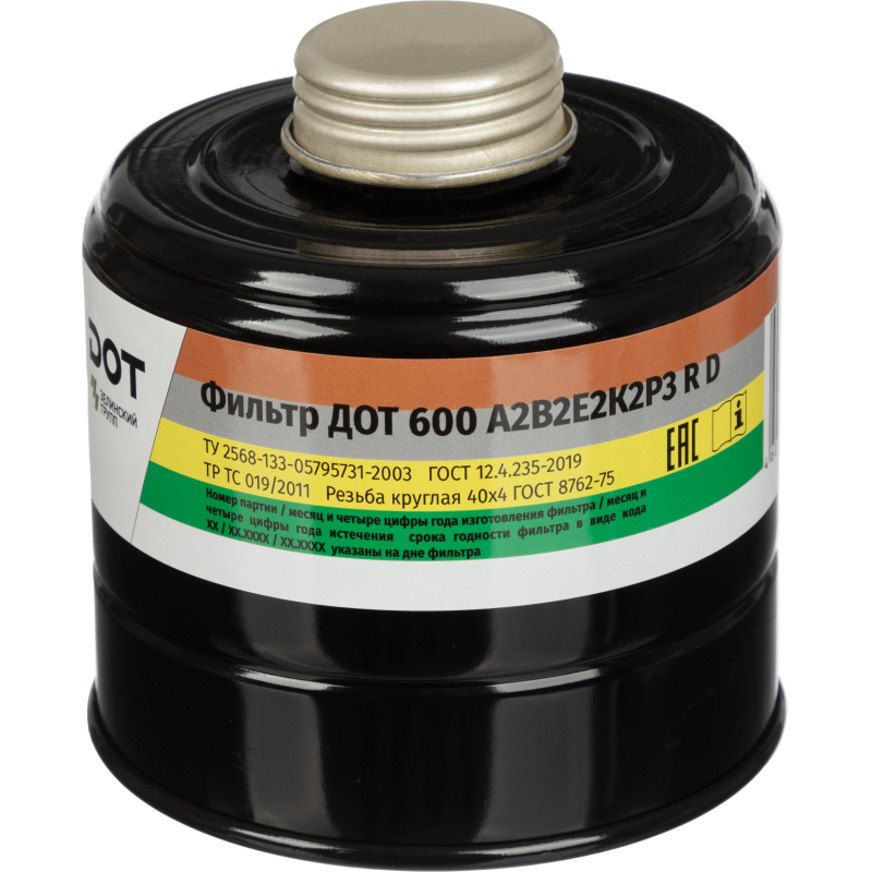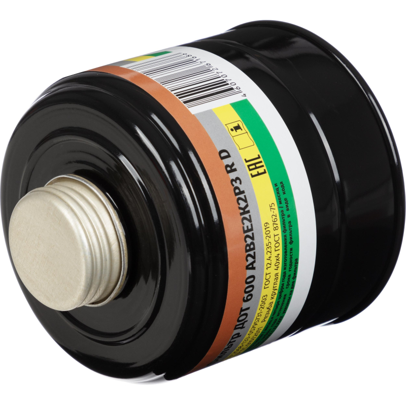 Фильтр комбинированный Дот 600 А2В2Е2К2Р3 R D с угольным слоем.Комбинированный фильтр предназначен для очистки вдыхаемого воздуха от органических и неорганических газов и паров, кислых газов, аммиака и его органических производных, аэрозолей. Фильтр подключается к лицевой части противогаза с помощью резьбового соединения.Фильтр нужно заменить немедленно при появлении запаха в подмасочном пространстве. Тип крепления: резьба. Перед использованием необходимо ознакомиться с руководством по эксплуатации. Рекомендуется для защиты от газов и парообразных веществ.Маркировка А2В2Е2К2Р3 R D:- A2 - защита от органических паров (класс 2).- B2 - защита от неорганических газов (класс 2). - E2 - защита от кислых газов (класс 2).- K2 - защита от аммиака и аминов (класс 2).- R3 - защита от аэрозолей (класс 3, фильтрация 99%).- R - многоразовое использование.- D - защита от запыления.Стандарты: ГОСТ 12.4.235-2012, ТР ТС 019/2011.