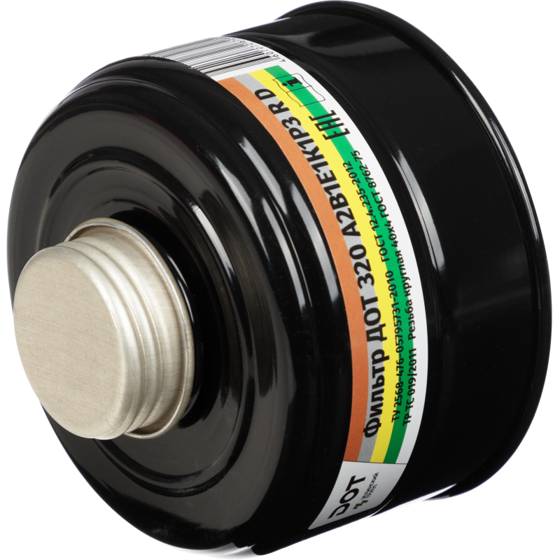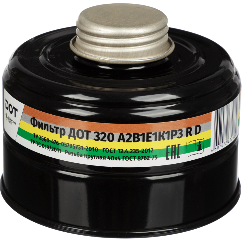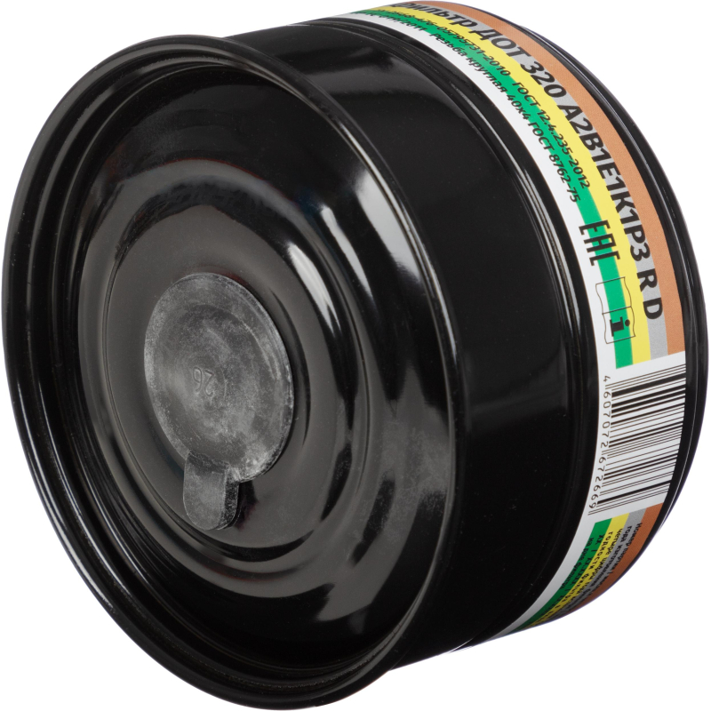Фильтр комбинированный Дот 320 А2В1Е1К1Р3 R D с угольным слоем.Предназначен для использования в составе противогазов с целью очистки вдыхаемого воздуха от различных типов газов и паров, а также аэрозолей. Он эффективен против органических газов и паров с температурой кипения выше 65C, неорганических газов и паров, кислых газов и паров, аммиака и его органических производных. Фильтр соединяется с лицевой частью противогаза с помощью резьбового соединения.По мере появления запаха в подмасочном пространстве фильтр необходимо срочно заменить. Гарантийный срок хранения составляет 5,5 лет. Перед использованием важно ознакомиться с руководством по эксплуатации. Тип крепления: резьба.Маркировка A2B1E1K1P3 R D:- A2 - защита от органических паров (класс 2).- B1 - защита от неорганических газов (класс 1).- E1 - защита от кислых газов (класс 1).- K1 - защита от аммиака и аминов (класс 1).- R3 - защита от аэрозолей (класс 3, 99% фильтрация).- R - многоразовый.- D - защищённый от запыления.Подходит для защиты от газов и парообразных веществ. Применим в различных отраслях, включая химию, сельское хозяйство, строительство и фармацевтику.Стандарты: ТР ТС 019/2011, ГОСТ 12.4.235-2012.