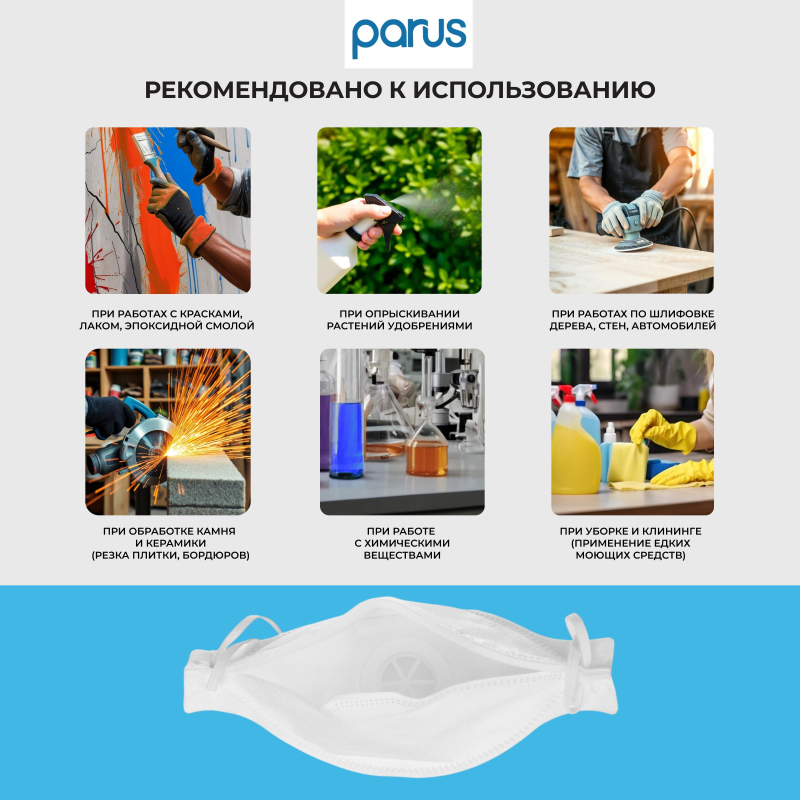 Респиратор Parus 1CK противоаэрозольный предназначен для защиты органов дыхания. Класс фильтрующей эффективности FFP1 до 4 ПДК. Респиратор с клапаном. Область применения: сельскохозяйственное производство, химическая переработка, строительство, обрабатывающая промышленность, металлообрабатывающая промышленность, нефтехимический комплекс, фармацевтическое производство, фармацевтика, деревообрабатывающая промышленность, машиностроение, судостроение, керамические производства, литейные производства, производство кирпича, работа в карьерах и открытых разрезах, агрохимия, работа с резиной и пластиком. Внимание! Регулируемые ремни оголовья, могут отличаться по внешнему виду (цвету) от их изображения на настоящем сайте. Производитель оставляет за собой право изменить цвет, регулируемых ремней оголовья. Внимание! Товар поставляется в нескольких вариантах дизайна (без возможности выбора). ЗАКОНОДАТЕЛЬНЫЕ И ТЕХНИЧЕСКИЕ ДОКУМЕНТЫ: