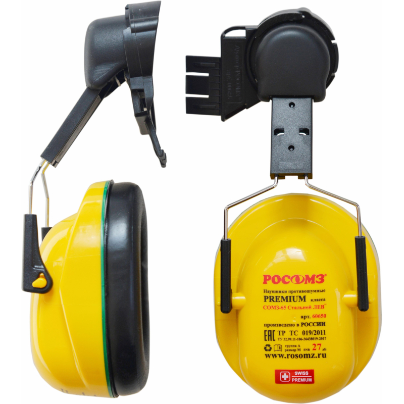 Наушники противошумные пассивные РОСОМЗ с креплением на каску 27 дБ желтые (60650). Наушники противошумные РОСОМЗ СОМЗ-65 Стальной ЛЕВ обеспечивают защиту от шума до 107 дБ (SNR - 27 дБ). Они предназначены для использования в различных отраслях промышленности, включая нефтяную и металлургическую. Модель особенно эффективна при работе в условиях повышенного уровня шума и низких температурах.Наушники оснащены универсальными адаптерами, которые позволяют крепить их к защитным каскам РОСОМЗ с возможностью установки лицевых щитков. Конструкция включает регулируемые по высоте держатели чашек. Стальные рычаги обеспечивают стабильное прижатие к голове.Амортизаторы выполнены из гипоаллергенного термоэластополимера, что гарантирует комфортное ношение. Звукоизолирующие вкладыши из вспененного полиуретана легко извлекаются для чистки. Масса наушников не превышает 190 г. Они соответствуют стандартам ТР ТС 019/2011 и ГОСТ 12.4.275-2014.Внешний вид и/или характеристики товара могут быть изменены производителем в соответствии с производственным процессом.