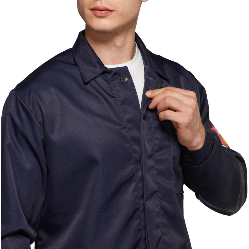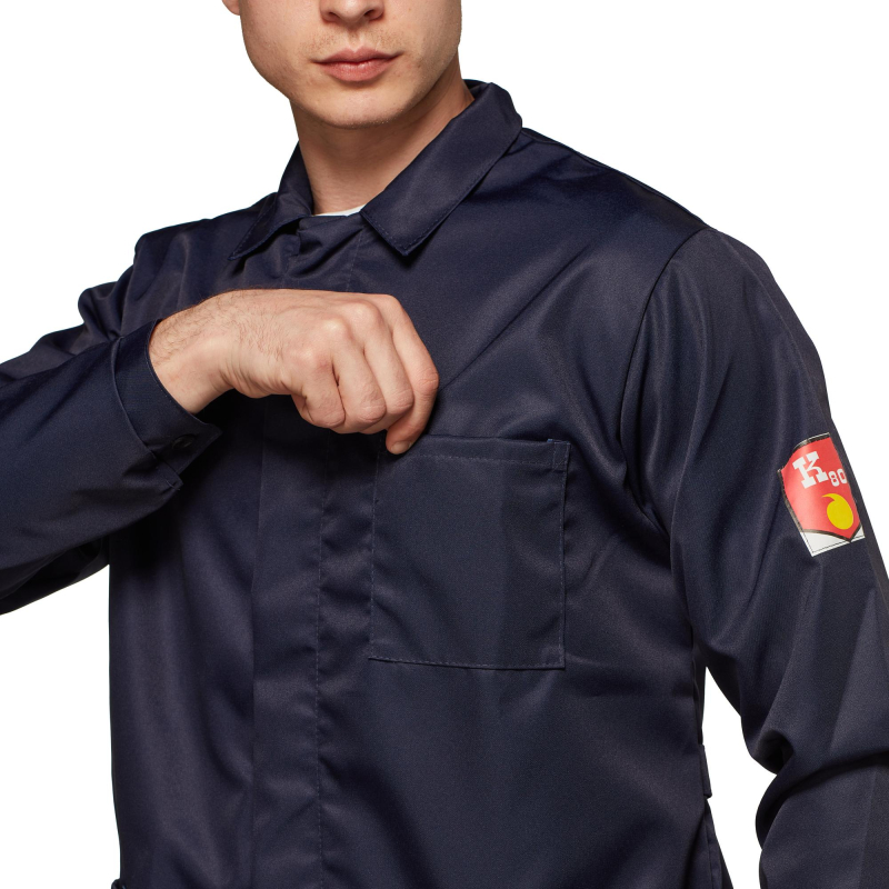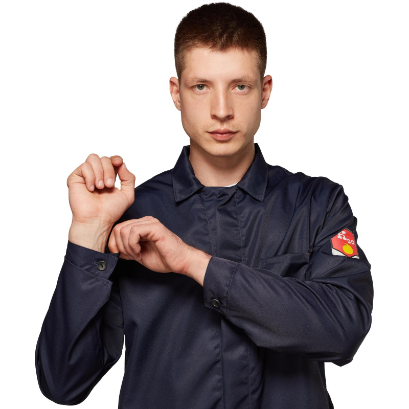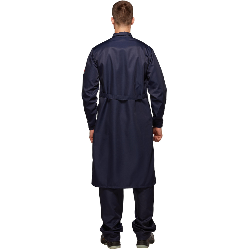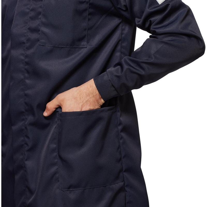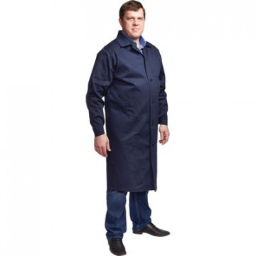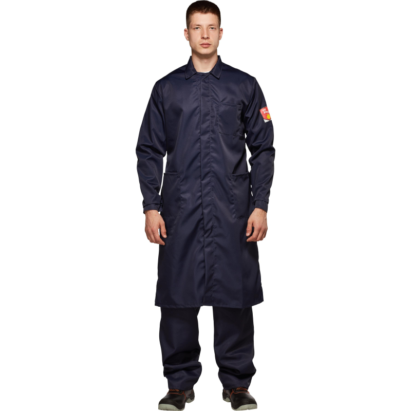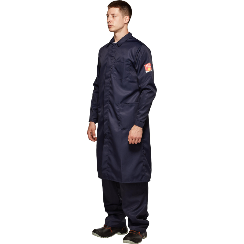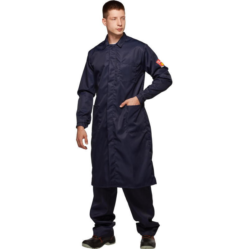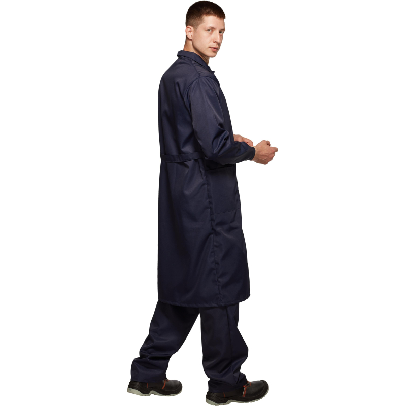 Халат мужской с центральной потайной застежкой на петли и пуговицы, кокеткой, втачным рукавом на манжете, накладными карманами, отложным воротником. Обеспечивает защиту от кислот до 80%. Изготовлен из лавсановой ткани плотностью 240 г/кв.м.