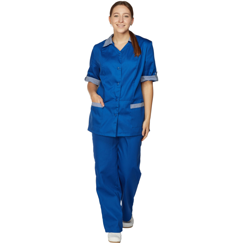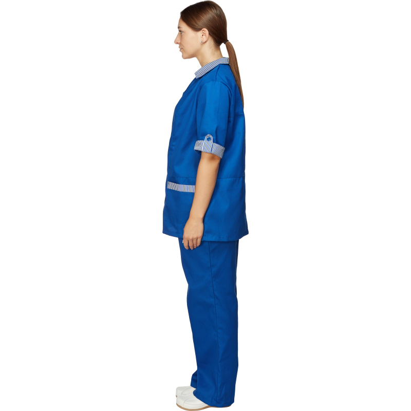 Костюм для горничных и уборщиц у07-КБР васильковый (размер 60-62, рост 158-164 см.) женский. Воротник, манжеты и карманы отделаны контрастной тканью. В комплект входят: брюки и рубашка. Плотность материала: 210 г/кв.м. Материал костюма: Смесовая ткань (Тип 1) - состоящей из полиэстера (80%) и хлопка (20%). Такое соотношение натуральных и синтетических волокон является оптимальным и обеспечивает высокие потребительские качества. Гигиенические: воздухопроницаемость, гипоаллергенность. Механические: прочность, износостойкость. Высокая плотность делает ткань пыленепроницаемой. Рубашка со шлицeй на спинке и боковыми разрезами имеет центральную застежку на пуговицы. Манжеты, верхние части карманов и воротник выполнены из голубой отделочной ткани. Брюки прямые, c поясом и застежкой на пуговицу и молнию, по бокам стянуты эластичной тесьмой, без карманов. Униформа для горничных и уборщиц проста в уходе, не мнется и быстро сохнет, а материал долгое время сохранит свой первоначальный, яркий цвет. Рекомендации по уходу: рекомендуется стирать при температуре не выше 40 градусов. Соответствие стандартам производства: ГОСТ 12.4.280-2014 Униформа рекомендована для сферы обслуживания, клининга, гостиничного бизнеса.