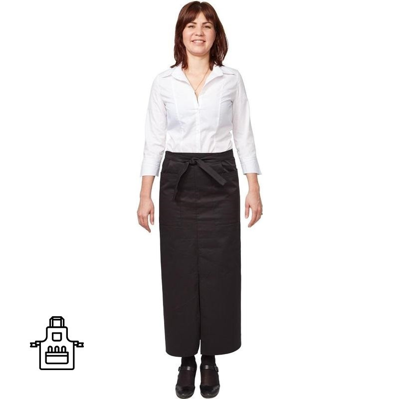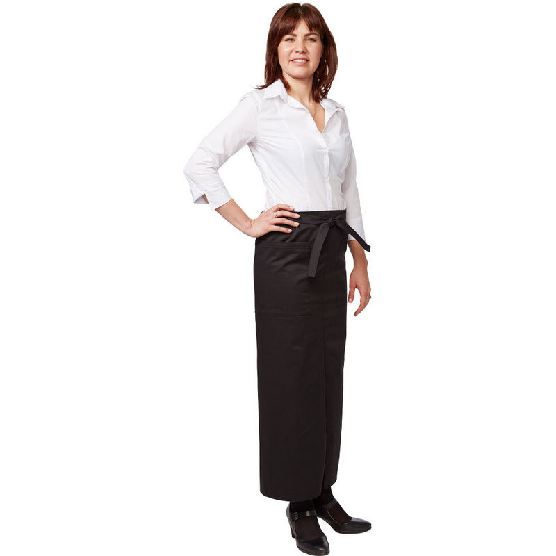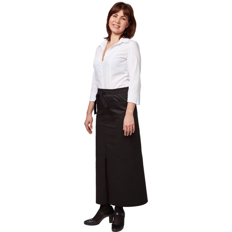 Фартук официанта длинный изготовлен из ткани форвард (состав: 65% полиэстер + 35% хлопок), плотностью 210 г/кв.м. Завязывается по талии поясом. С разрезом спереди и двумя накладными карманами. Размеры фартука: 110х95. Цвет: черный. В коллекции представлены фартуки для официантов в черном и коричневом цветах, варианты длины: короткий (45 см), средний (75 см) и длинный (95 см). Могут использоваться для парикмахеров.