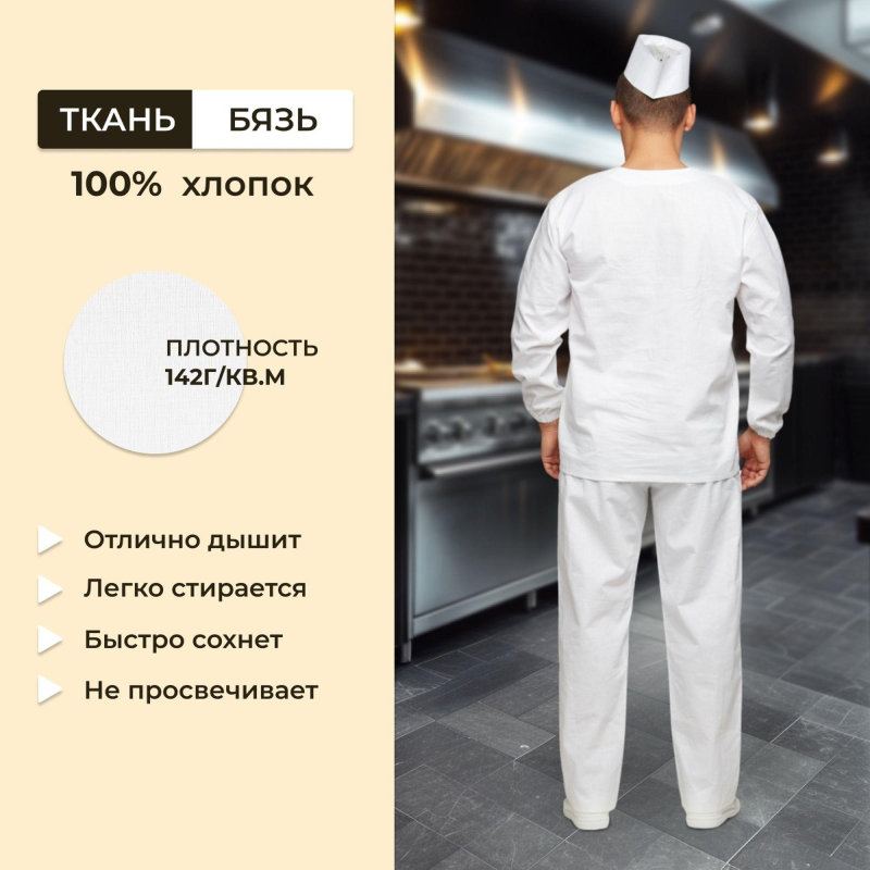 Костюм пекаря универсальный с длинным рукавом состоит из куртки и брюк. Куртка свободного покроя имеет нагрудный накладной карман. Брюки с поясом на резинке. Костюм, предназначенный для использования в производственных цехах, выполнен из бязи плотностью 142 г/кв.м, цвет белый. Размер 52-54, рассчитан на рост 158-164 см. Температурный режим стирки - не выше 40 градусов. Коллекция униформы для пекарей у05 представлена костюмами куртка с брюками у05-КБР и халатами с длинным рукавом у05-ХЛ. Законодательные и технические документы