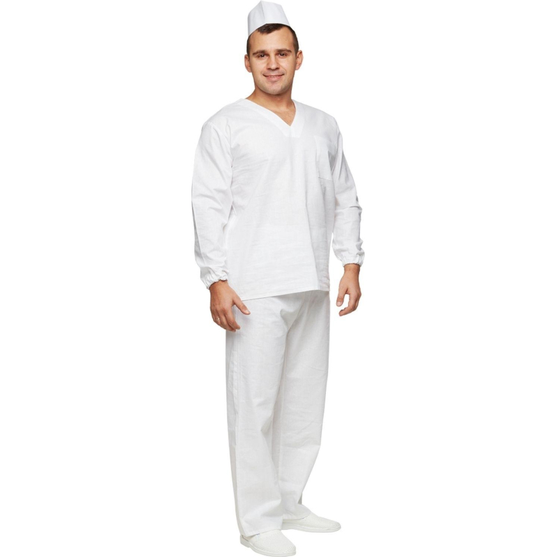 Костюм пекаря универсальный с длинным рукавом состоит из куртки и брюк. Куртка свободного покроя имеет нагрудный накладной карман. Брюки с поясом на резинке. Костюм, предназначенный для использования в производственных цехах, выполнен из бязи плотностью 142 г/кв.м, цвет белый. Размер 60-62, рассчитан на рост 158-164 см. Температурный режим стирки - не выше 40 градусов. Коллекция униформы для пекарей у05 представлена костюмами куртка с брюками у05-КБР и халатами с длинным рукавом у05-ХЛ. Законодательные и технические документы