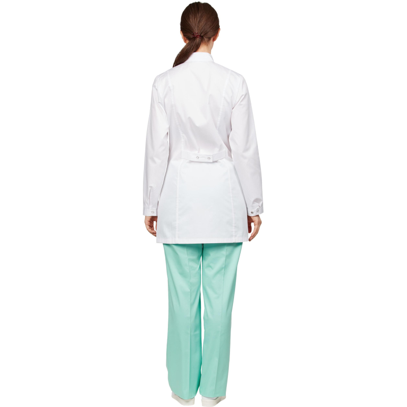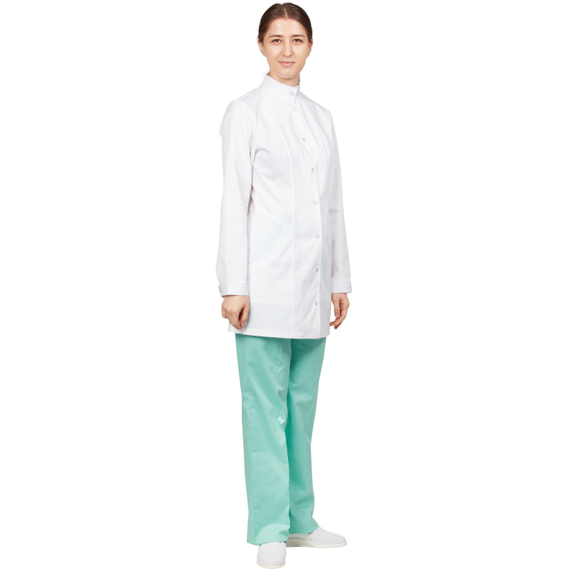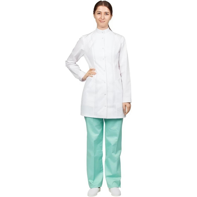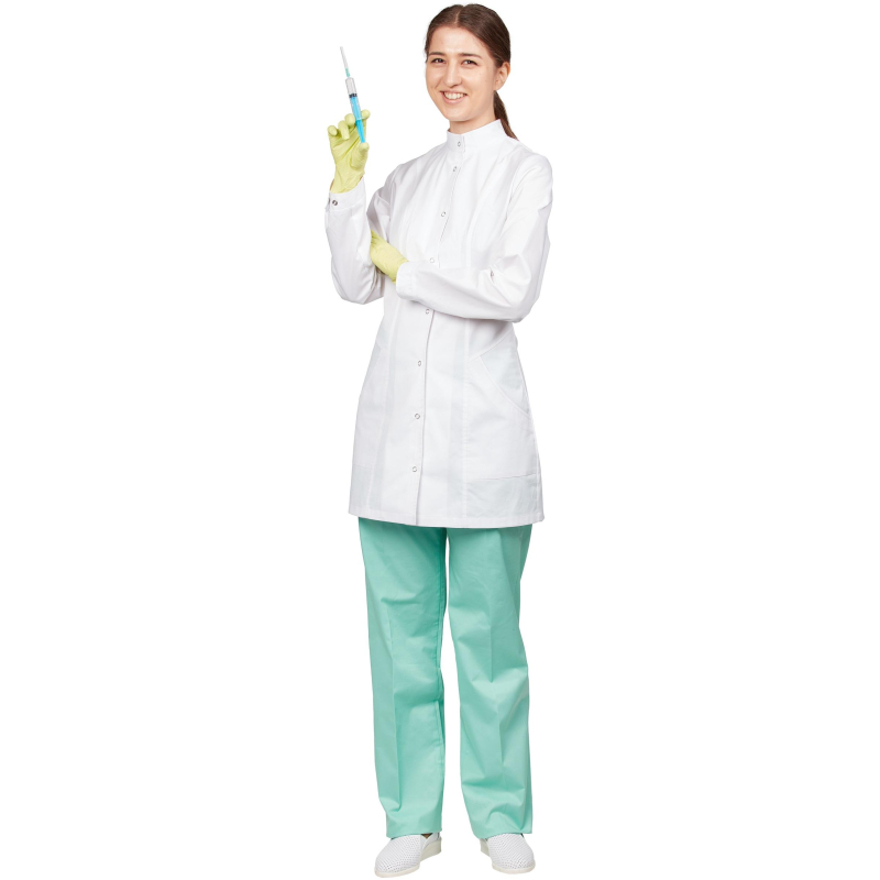 Брюки женские М-14-БР прямые изготовлены из смесовой ткани ( 55% хлопок 45% полиэстер) плотностью 150 г/кв.м с водоотталкивающей пропиткой. Цвет зеленый (мятный), размер 52-54, рассчитаны на рост 170-176. Пояс притачной на резинке. Брюки с застроченными стрелками на передних половинках. На правой передней половинке брюк расположен накладной карман, который одной стороной входит в боковой шов. Стирку брюк необходимо производить в обычном режиме, не превышая температуру 40 градусов Цельсия. Запрещено отбеливать, разрешена химчистка в обычном режиме. Сушить в подвешенном состоянии не отжимая, утюжить при температуре не выше 150 градусов. Брюки относятся к спецодежде для защиты от общих производственных загрязнений.Коллекция медицинской униформы м14 представлена брюками м14-БР в розовом, голубом и зеленом цветах. Продукция не является изделием медицинского назначения, производится согласно требованиям ГОСТ 12.4.280-2014. Рекомендуется для работников медицинских, санитарных, лечебно-профилактических и других организаций или учреждений здравоохранения: высший, средний и младший персонал (врачи, медицинские сестры, акушеры, техники, лаборанты, массажисты, фармацевты, сиделки, санитарки и т.д.), административно-хозяйственной группы (заведующие, кладовщики, кухонный персонал и т.д.).
