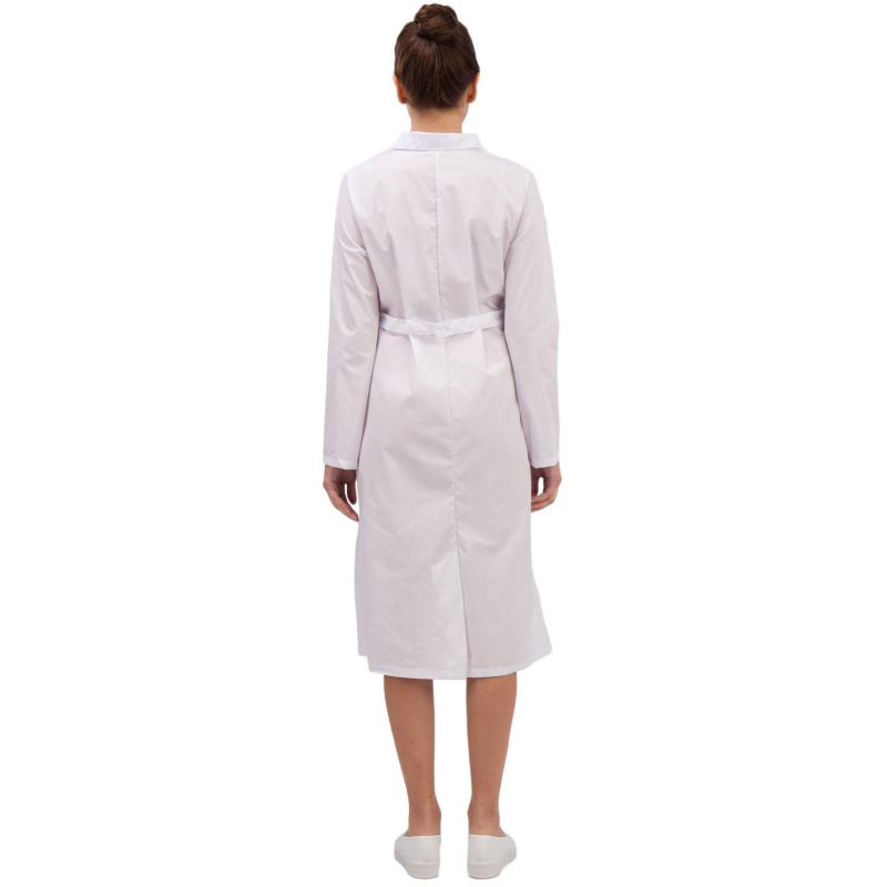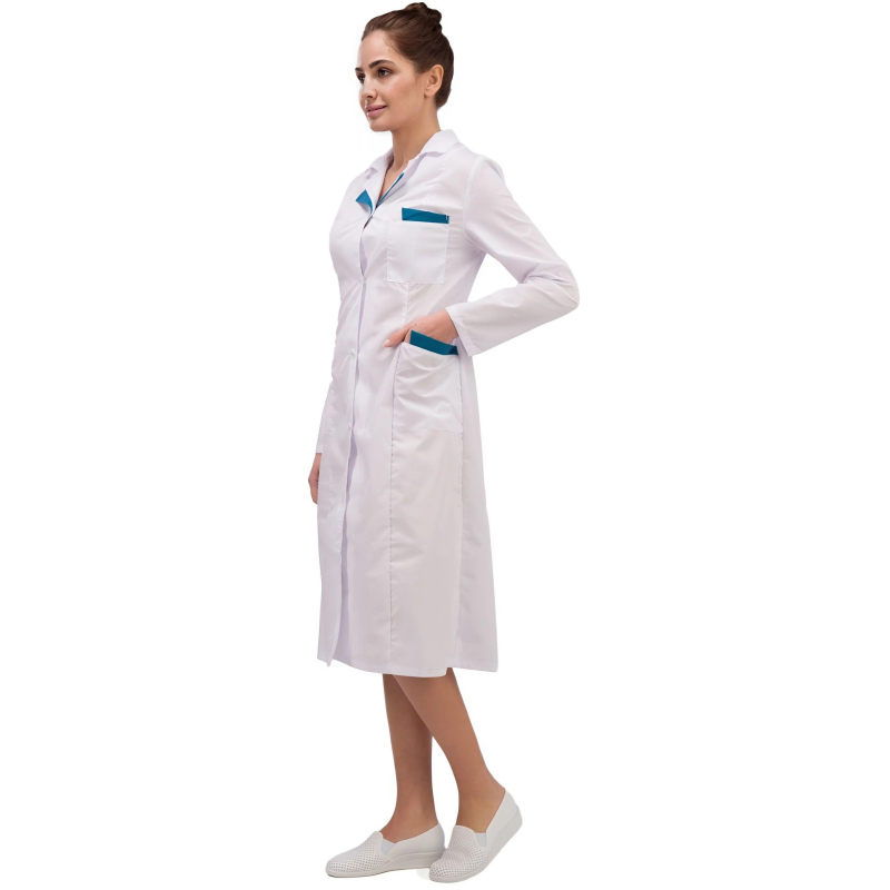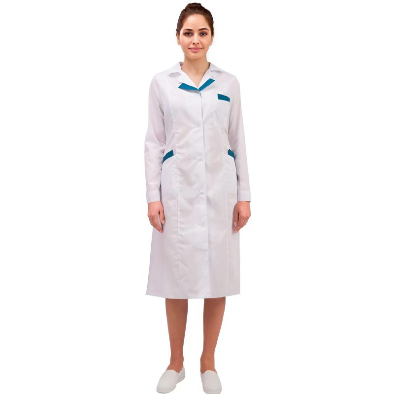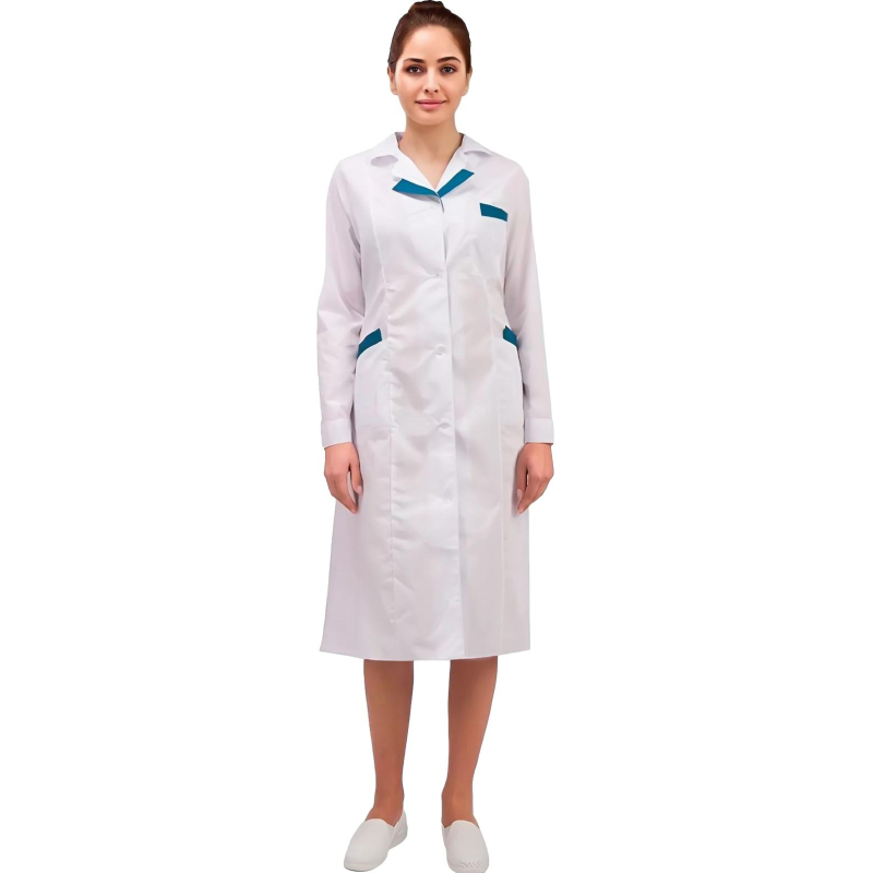 Халат женский м01-ХЛ. Размер: 44-46. Рост: 170-176. Халат с центральной застежкой на пуговицы, с фигурной отделкой на лацканах и карманах. Ширина по линии талии регулируется хлястиком. Ткань: Ти-Си (состав: 65% - полиэфир, 35% - хлопок). Рукав длинный. Халат предназначен для защиты от общих производственных загрязнений. Плотность: 120 гр/м2. Коллекция медицинской униформы м01 представлена комплектами куртка с брюками м01-КБР и халатами м01-ХЛ. Продукция не является изделием медицинского назначения, производится согласно требованиям ГОСТ 12.4.280-2014. Рекомендуется для работников медицинских, санитарных, лечебно-профилактических и других организаций или учреждений здравоохранения: высший, средний и младший персонал (врачи, медицинские сестры, акушеры, техники, лаборанты, массажисты, фармацевты, сиделки, санитарки и т.д.), административно-хозяйственной группы (заведующие, кладовщики, кухонный персонал и т.д.). Изделия отшиты из белой ткани, но с сиреневым оттенком, связано это со спецификой отбеливания, чтобы ткань не желтила. Цвет стабилизируется после нескольких стирок.