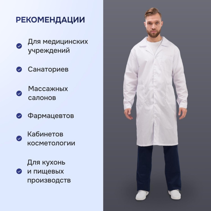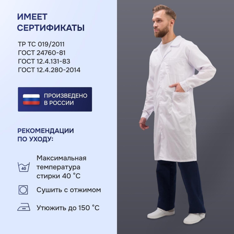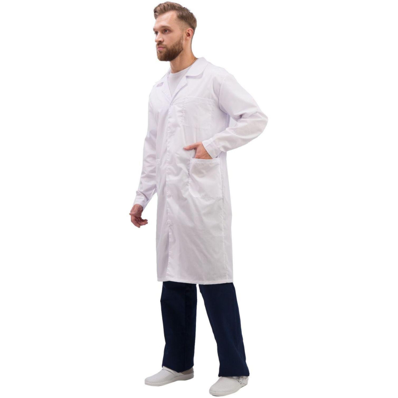 Халат мужской Медик м04-ХЛ, цвет белый, (размер 64-66, рост 170-176) белого цвета с отложным воротником. Классическая модель изготовлена из смесовой ткани Ти-Си плотностью 120 г/кв.м, состоящей на 65% из полиэфира и на 35% из хлопка. Не мнется, легко и быстро стирается, быстро сохнет. Долго сохраняет свой первоначальный яркий цвет. Ткань дышит, благодаря входящему в состав хлопку, имеет повышенный срок службы и проста в уходе, благодаря полиэфиру. Застежка центральная, на пуговицах; на лицевой стороне расположены два накладных кармана. Униформа рекомендована для сферы красоты и здоровья: медицинские учреждения, центры. Коллекция м04 представлена халатами м04-ХЛ как в женской, так и в мужской линейке. Продукция не является изделием медицинского назначения, производится согласно требованиям ГОСТ 12.4.280-2014. Рекомендуется для работников медицинских, санитарных, лечебно-профилактических и других организаций или учреждений здравоохранения: высший, средний и младший персонал (врачи, медицинские сестры, акушеры, техники, лаборанты, массажисты, фармацевты, сиделки, санитарки и т.д.), административно-хозяйственной группы (заведующие, кладовщики, кухонный персонал и т.д.). Изделия отшиты из белой ткани, но с сиреневым оттенком, связано это со спецификой отбеливания, чтобы ткань не желтила. Цвет стабилизируется после нескольких стирок.