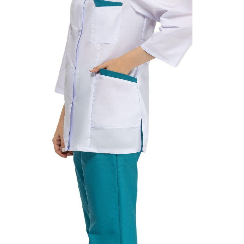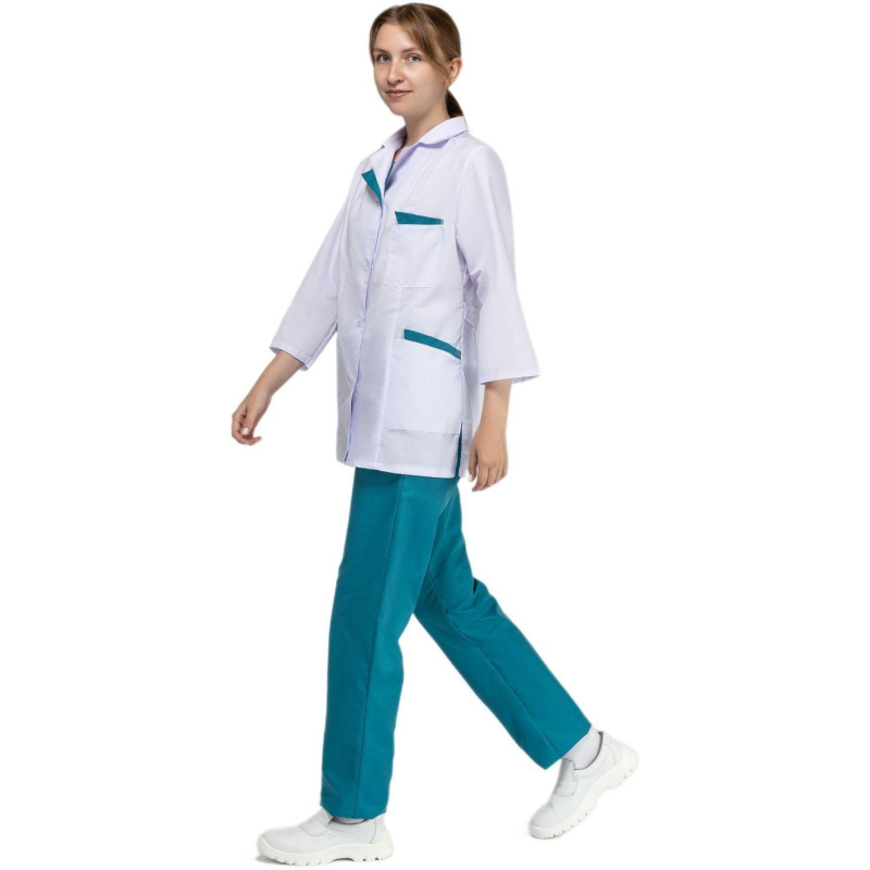 Костюм медицинский м01-КРБ (куртка+брюки). Размер: 44-46. Рост: 158-164. Куртка с застежкой на пуговицы, накладными карманами и с фигурной отделкой на лацканах и карманах. Ширина по линии талии регулируется хлястиком. Брюки свободного покроя на резинке. Ткань: Ти-Си (состав: 65% - полиэфир, 35% - хлопок). Плотность: 120 гр/м2.Коллекция медицинской униформы м01 представлена комплектами куртка с брюками м01-КБР и халатами м01-ХЛ. Продукция не является изделием медицинского назначения, производится согласно требованиям ГОСТ 12.4.280-2014. Рекомендуется для работников медицинских, санитарных, лечебно-профилактических и других организаций или учреждений здравоохранения: высший, средний и младший персонал (врачи, медицинские сестры, акушеры, техники, лаборанты, массажисты, фармацевты, сиделки, санитарки и т.д.), административно-хозяйственной группы (заведующие, кладовщики, кухонный персонал и т.д.). Изделия отшиты из белой ткани, но с сиреневым оттенком, связано это со спецификой отбеливания, чтобы ткань не желтила. Цвет стабилизируется после нескольких стирок.